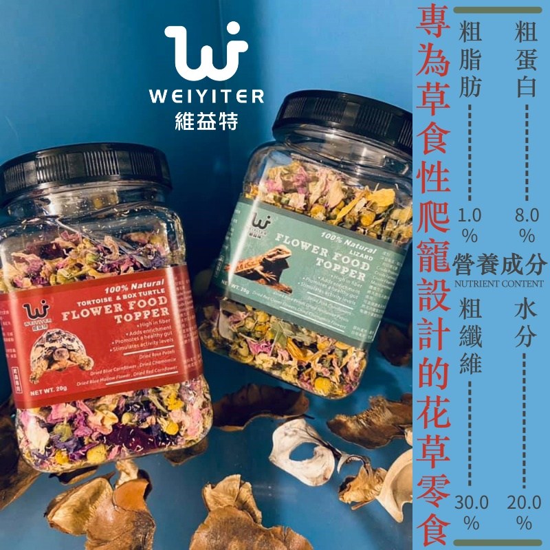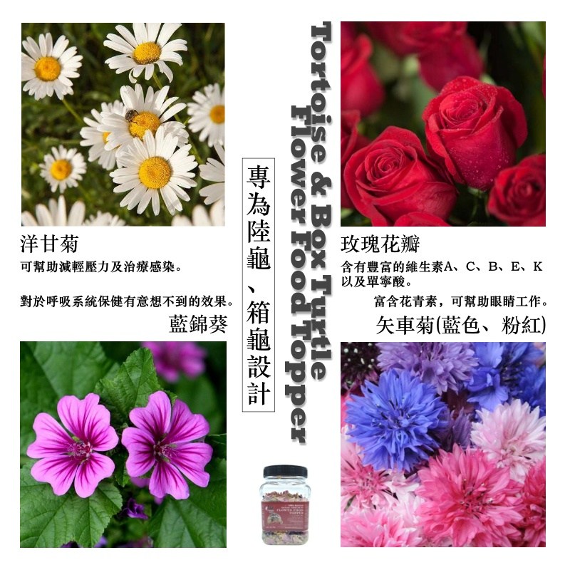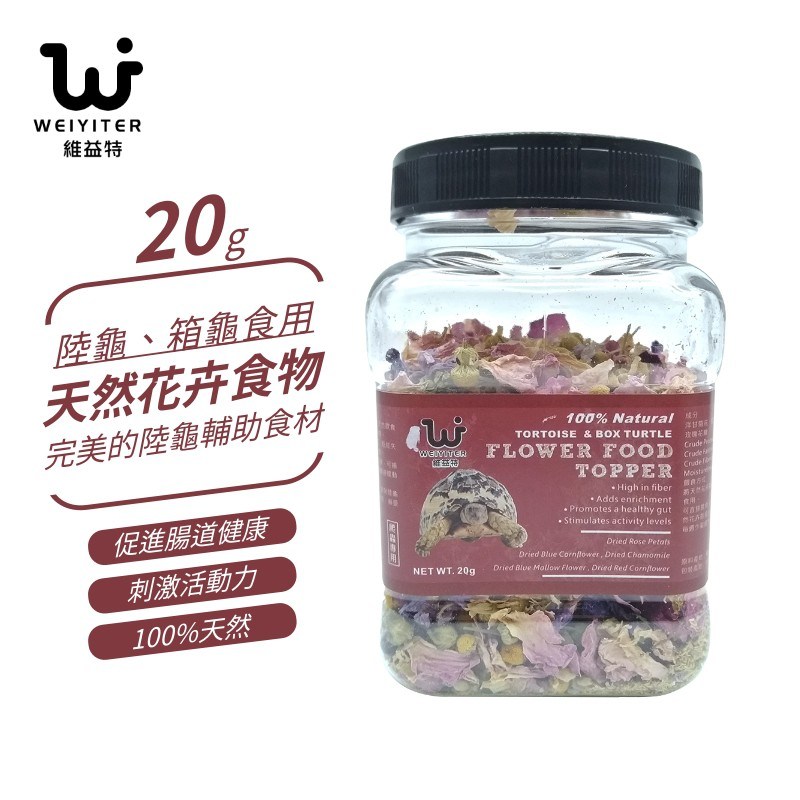 為您的陸龜提供天然美味的饗宴,精選多種乾燥花卉,如玫瑰花瓣、藍矢車菊、洋甘菊等,富含纖維,有助於促進腸道健康,並增添食物的豐富性。這款花卉食物不僅能刺激陸龜的活動力,還能為牠們提供日常飲食所需的營養補充,不含任何人工添加劑,讓您的愛龜吃得安心又健康。只需將少量花卉撒在飼料上,或加少許水混合,即可輕鬆餵食,為您的陸龜帶來美味又健康的享受。