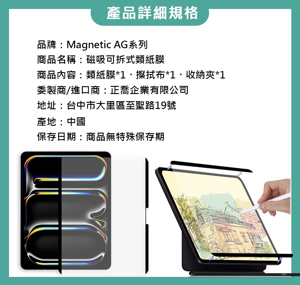 為您的2024 iPad Air6 11吋帶來更優質的書寫和繪畫體驗!這款Magnetic AG系列磁吸可拆式類紙膜,採用獨特的類紙表面處理,能模擬真實紙張的觸感,讓您在平板上也能享受如同在紙上書寫的流暢感。磁吸設計方便快速安裝和拆卸,隨時切換使用模式。此外,產品包含類紙膜*1、擦拭布*1和收納夾*1,讓您保持螢幕清潔,方便收納。單一顏色設計,簡約時尚,是iPad Air6的理想配件。