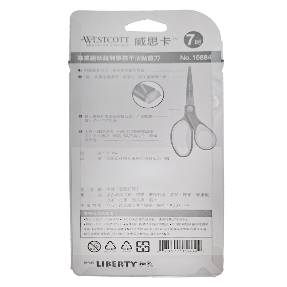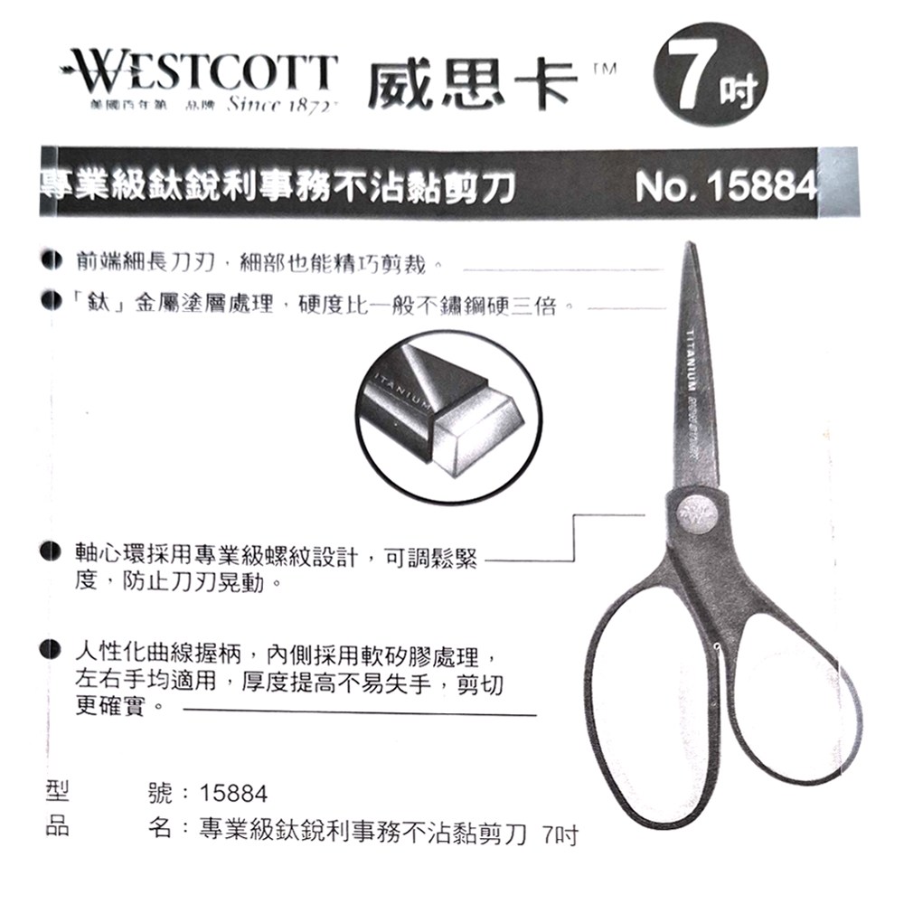 WESTCOTT 威思卡鈦銳利不沾黏剪刀,採用鈦金屬刀刃,鋒利耐用且不易沾黏,剪裁各種材質都能輕鬆應對。7吋的尺寸設計,無論是辦公室文件處理還是居家手工藝創作,都能得心應手。人體工學握柄提供舒適的握持感,即使長時間使用也不易疲勞。這款剪刀適用於剪裁紙張、皮革、布料等多種材質,是您工作和生活中的好幫手。美國銷量第一的品質保證,讓您買得放心,用得安心。