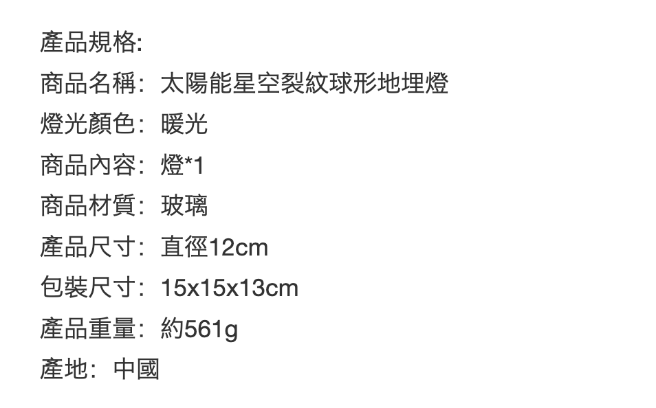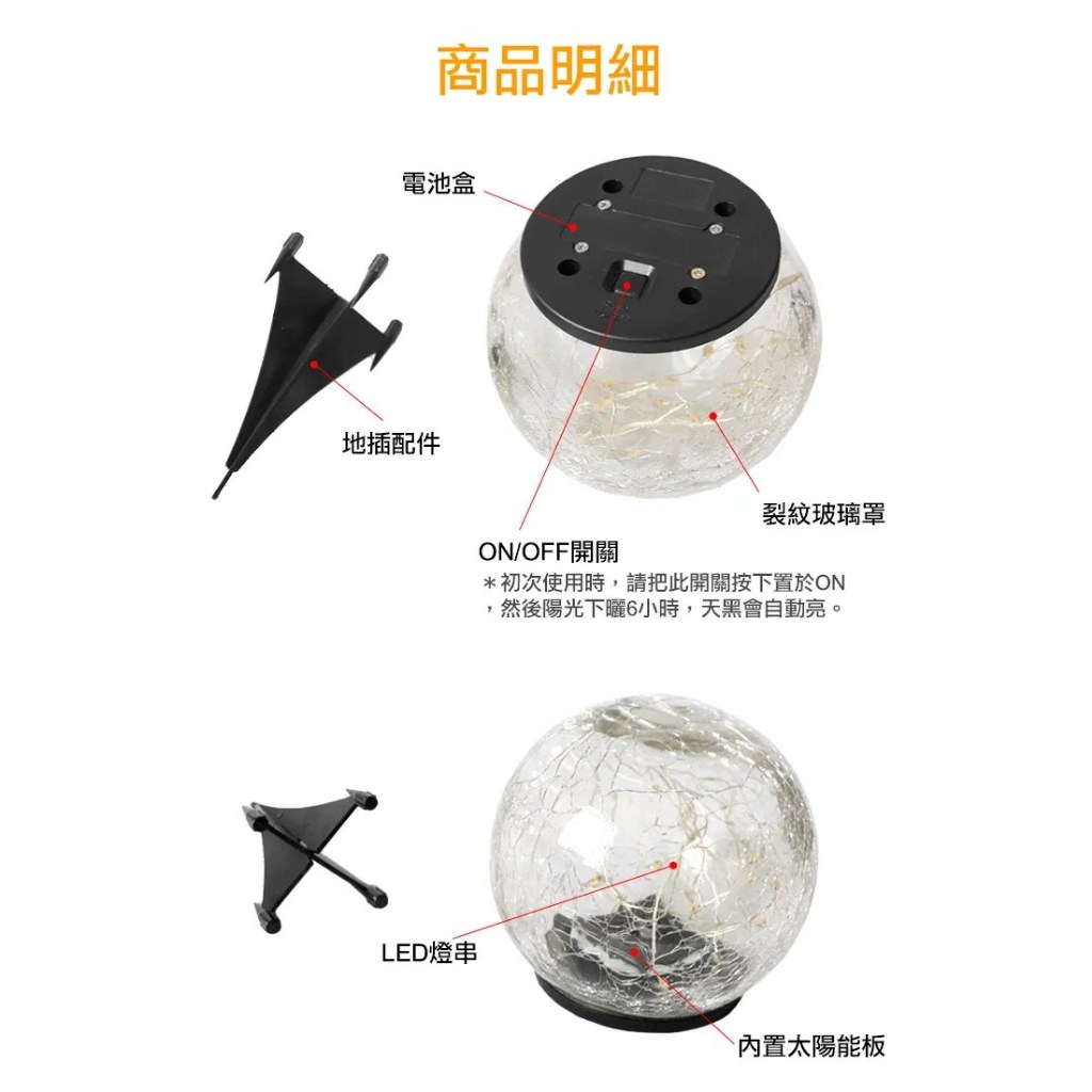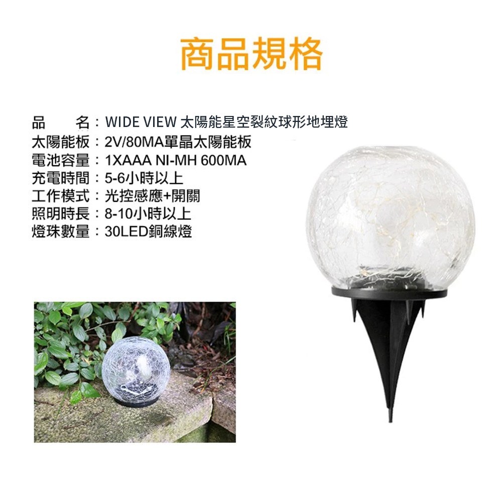 WIDE VIEW 太陽能星空裂紋球形地埋燈,為您的戶外空間增添一抹迷人的光彩。這款草地燈採用太陽能充電,白天吸收陽光,夜晚自動點亮,無需額外電源。裂紋玻璃燈罩搭配暖光LED燈珠,營造出浪漫溫馨的氛圍,彷彿置身於星空之下。燈體直徑12公分,單品高度12公分,小巧精緻,易於安裝,只需將地插插入草地或泥土中即可。無論是點綴花園、庭院還是小徑,都能帶來意想不到的美麗效果。