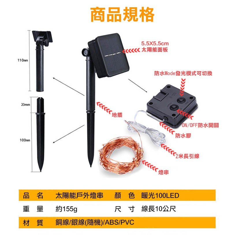 這款10米長的太陽能裝飾燈串,配有100個暖光LED燈泡,為您的戶外空間增添溫馨浪漫的氛圍。採用太陽能供電,無需額外電費。燈串線材柔軟可彎曲,可隨意造型,適用於庭院、陽台、花園等各種戶外場所。暖光燈色柔和不刺眼,營造舒適的照明效果。此外,燈串具備防水功能,無懼風雨,讓您安心使用。