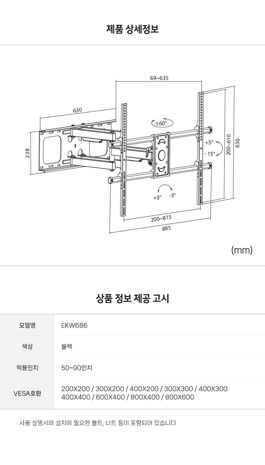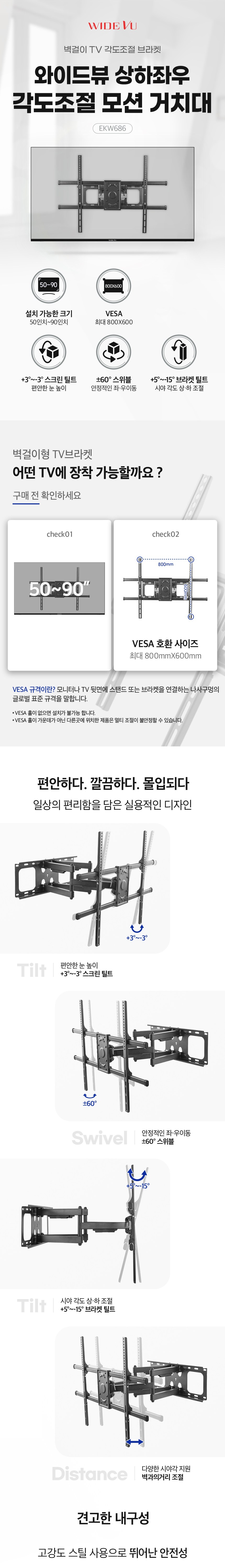 WIDE VU壁掛式電視角度調節支架EKW686,為您的家庭影音體驗帶來極致的舒適與便利。這款支架適用於50吋至90吋的電視,採用高強度鋼材,最大承重75公斤,確保電視安全穩固。其上下左右角度調節功能,讓您輕鬆調整至最佳觀影角度,享受舒適的視線高度。相容多種VESA規格,安裝簡便,讓您輕鬆打造理想的家庭影音空間。無論是客廳還是臥室,都能享受沉浸式的觀影體驗。