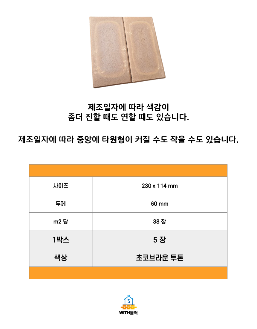 WITH BLOCK高強度黃土人行道磚採用純黃土以1200度高溫燒製而成,堅固耐用,適合戶外人行道鋪設。巧克力棕雙色設計,美觀大方,能為您的庭院或步道增添色彩。此磚塊尺寸為230 x 114 mm,厚度60 mm,每平方米約需38塊。每箱包含5塊磚,方便您根據需求購買。由於製造日期不同,磚塊顏色和中心橢圓形狀可能略有差異,敬請留意。