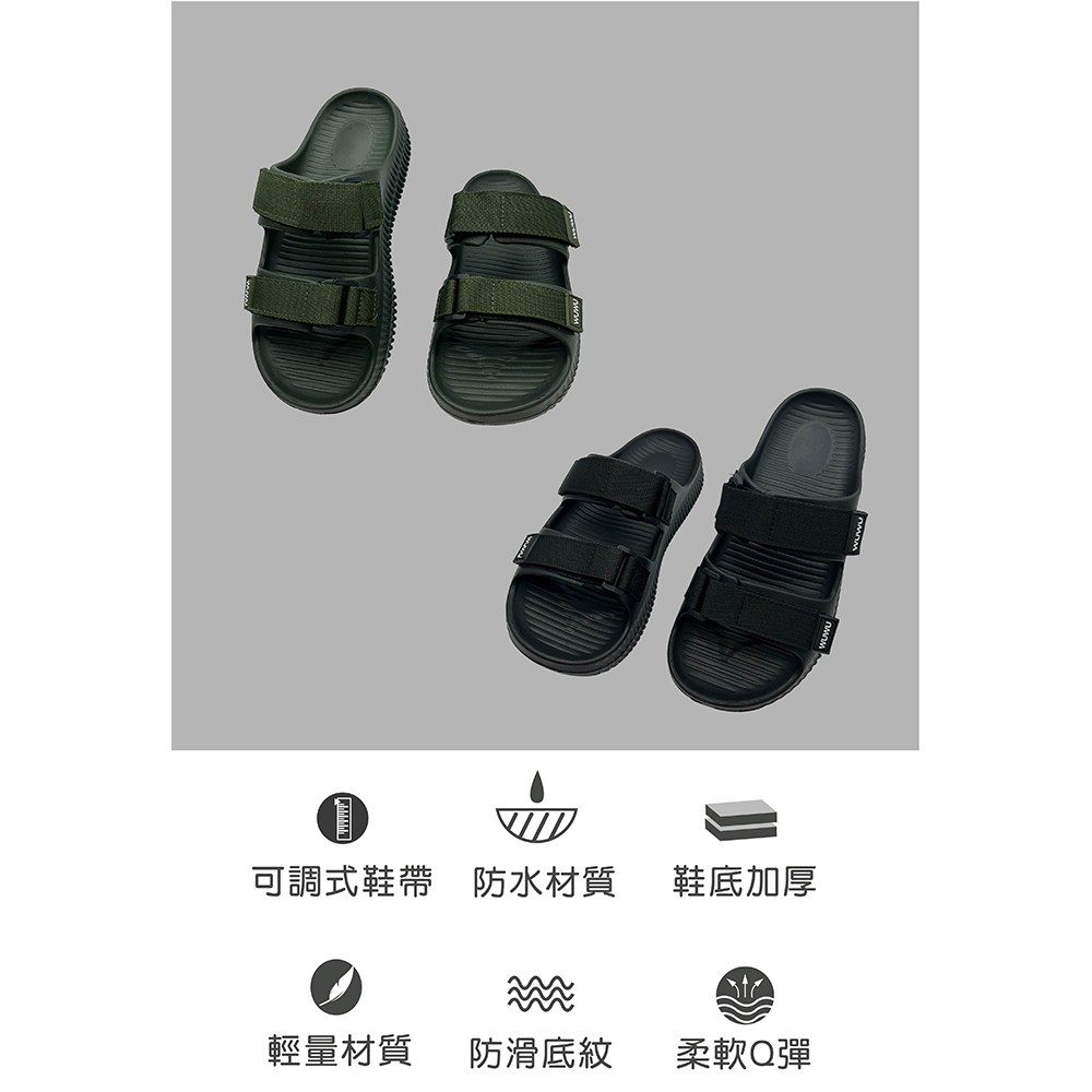 WUWU荒野雙帶室外拖鞋,採用雙帶設計,提供穩固支撐,讓您在室內外都能活動自如。輕量材質讓您穿著無負擔,即使長時間穿著也能感到舒適自在。簡約時尚的外觀,易於搭配各種休閒服飾,展現您的個人風格。鞋底紋路增加摩擦力,提供良好的防滑效果,確保行走安全。綠色配色清新自然,為您的穿搭增添一抹亮色。