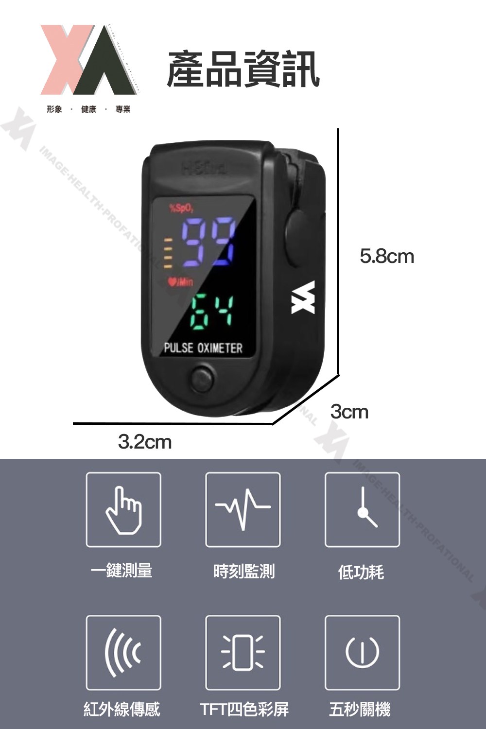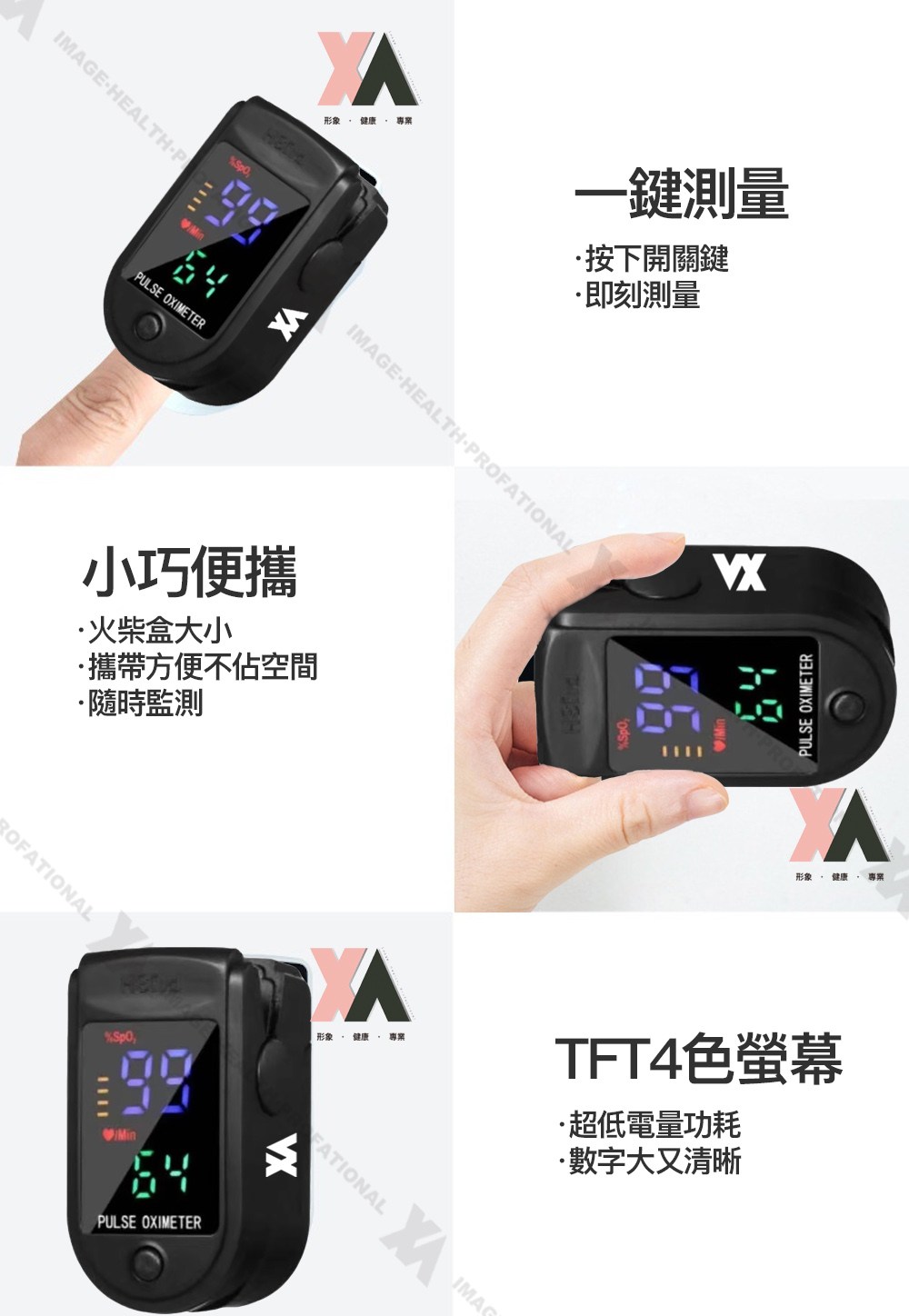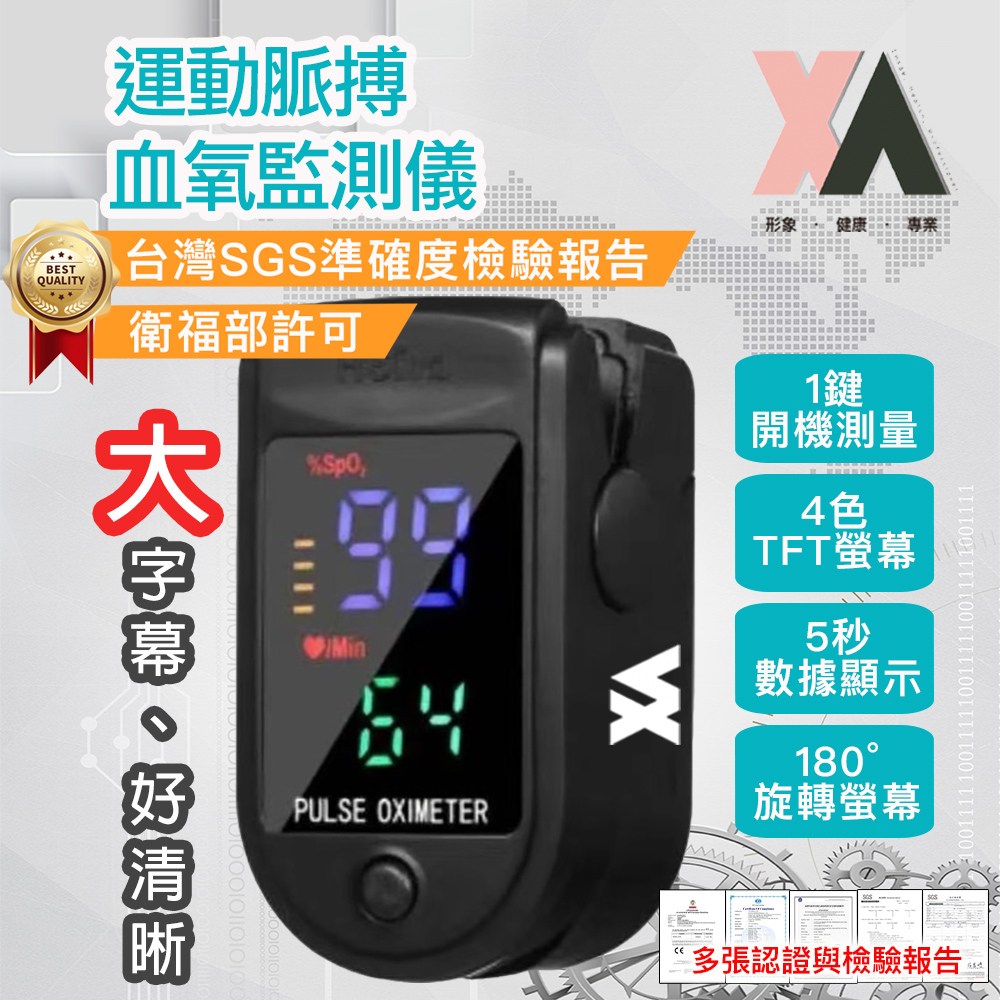 XA 運動脈搏血氧監測儀,小巧輕便,隨時掌握您的健康狀況。這款監測儀採用先進的光電傳感技術,快速準確地測量血氧飽和度和心率。其大字體四色TFT螢幕,即使在光線不足的環境下也能清晰讀取數據。產品通過台灣SGS精準度檢驗,並獲得衛福部食藥署許可,品質值得信賴。適合各年齡層人士使用,特別是運動愛好者、長者、孕婦及有呼吸道問題的人士。