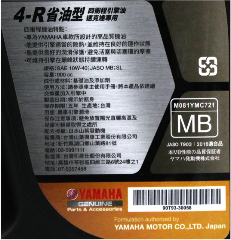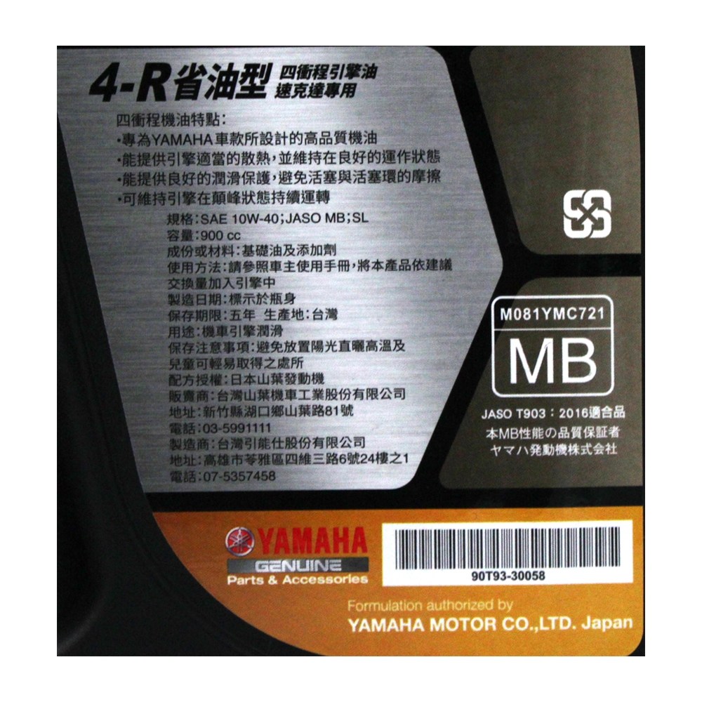 YAMAHA YAMALUBE 4R 10W40 4T 山葉原廠合成機油,是專為四行程引擎設計的高品質機油,容量為900cc。此款機油能提供引擎適當的散熱,維持良好的運作狀態,並提供良好的潤滑保護,避免活塞與活塞環的摩擦,確保引擎在顛峰狀態下持續運轉。符合SAE 10W-40及JASO MB規格,為您的愛車提供最佳的保護。選擇YAMALUBE,讓您的機車引擎保持最佳狀態,延長使用壽命。