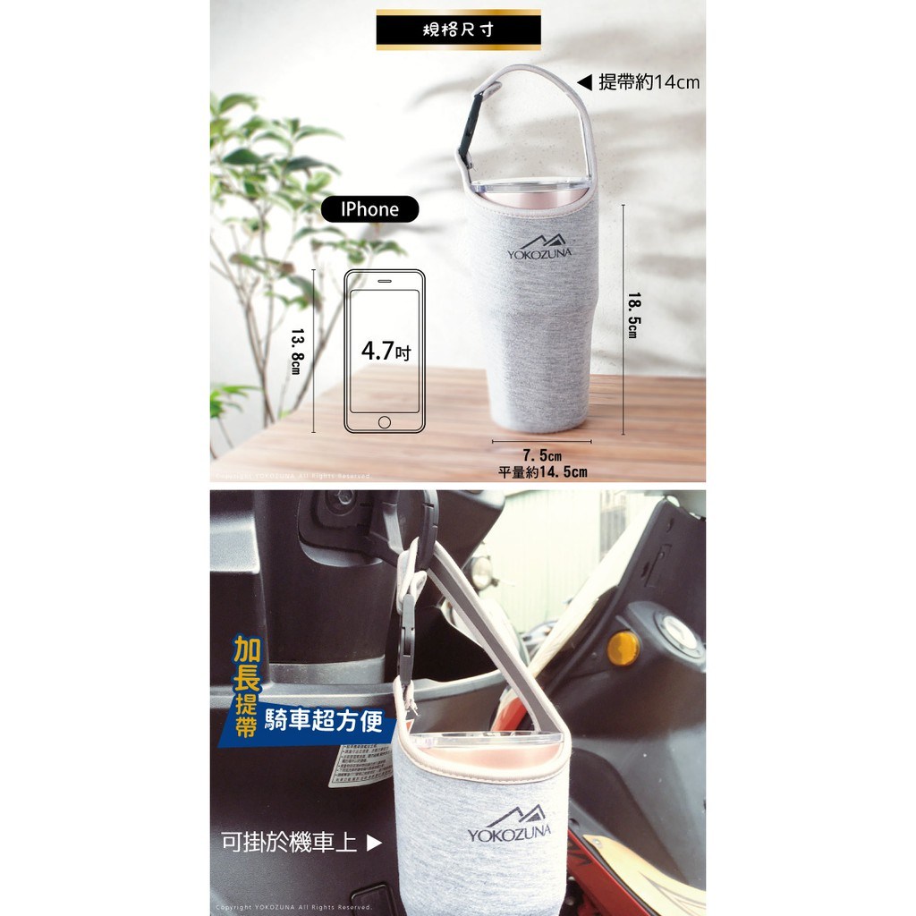 - 手提杯袋使用彈性布料,完整包覆水壺,有效減緩碰撞,保護您的杯子。