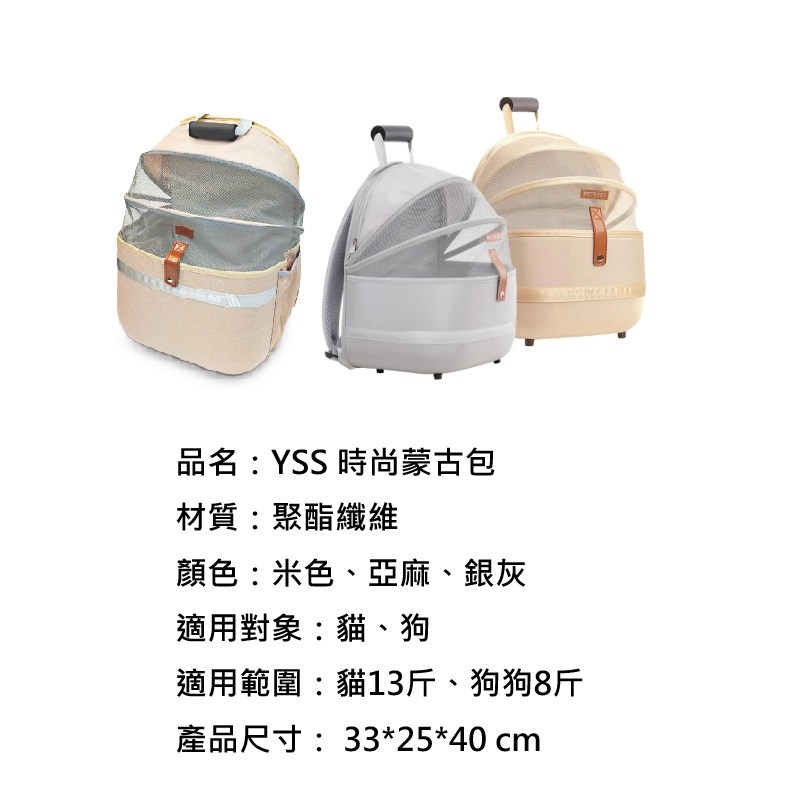 YSS時尚蒙古包寵物背包,米色,為您的愛寵提供時尚舒適的外出體驗。蒙古包造型設計,寬敞透氣,讓寵物在旅途中也能享受舒適空間。輕巧材質,方便攜帶,無論是短途散步或長途旅行,都能輕鬆帶著愛寵同行。可折疊收納設計,節省空間,讓居家環境更加整潔。時尚米色外觀,讓您的愛寵成為眾人矚目的焦點。