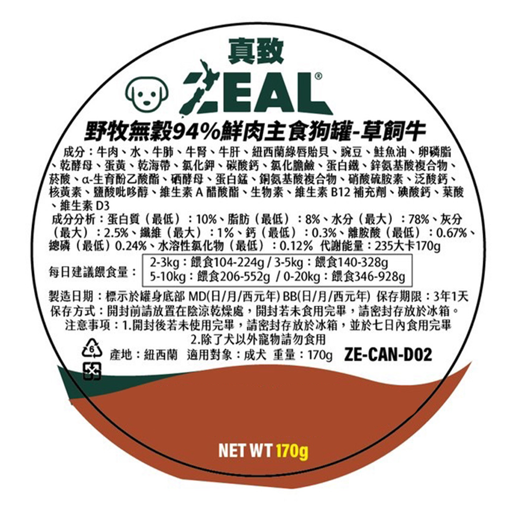 ZEAL真致野牧無穀94%鮮肉主食狗罐,選用高品質草飼牛肉,提供狗狗豐富的蛋白質與營養。無穀物配方,呵護愛犬腸胃,減少過敏原。適合所有生命階段的狗狗食用,從幼犬到老犬都能享受美味與健康。獨特肉汁塊質地,口感豐富,增加狗狗的食慾。同時添加皮膚和毛髮健康所需的營養成分,讓愛犬擁有亮麗毛髮。