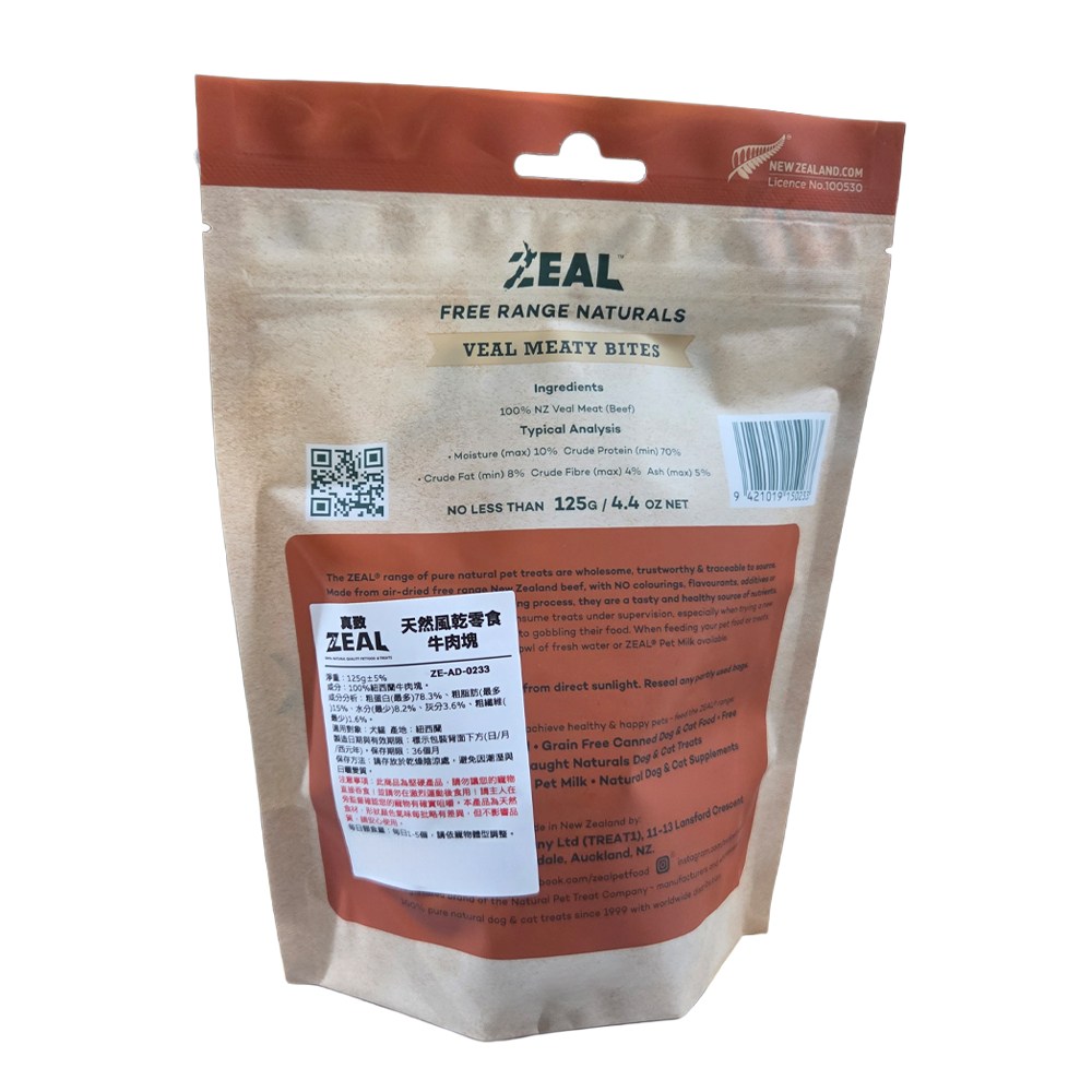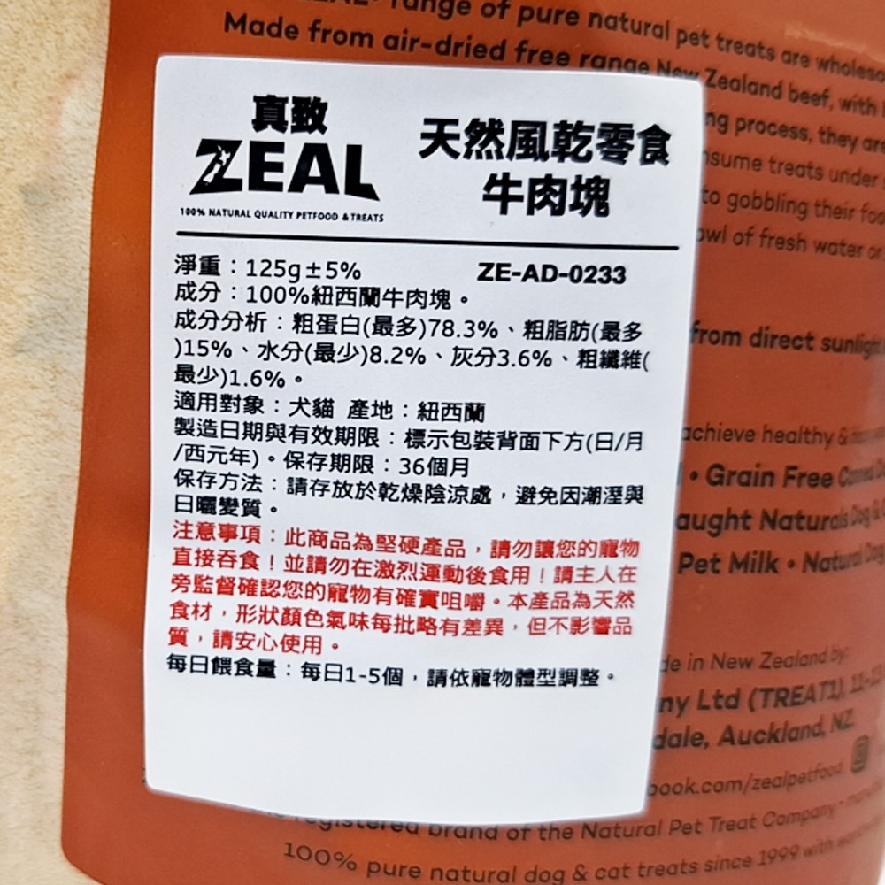 ZEAL 真致天然風乾紐西蘭牛肉塊,嚴選高品質的紐西蘭牛肉,經過特殊風乾製程,完整保留牛肉的原始風味與營養價值。分段設計方便餵食,適合作為犬隻的日常零食或訓練獎勵。牛肉富含蛋白質,有助於犬隻維持健康活力。無添加人工色素及香料,讓您的愛犬安心享用美味。每日適量餵食,讓您的寵物享受健康美味的零食。