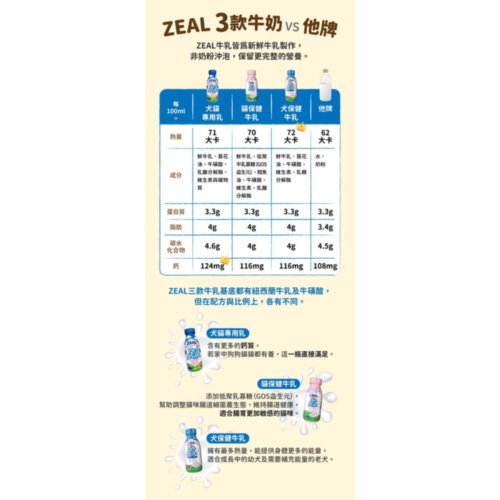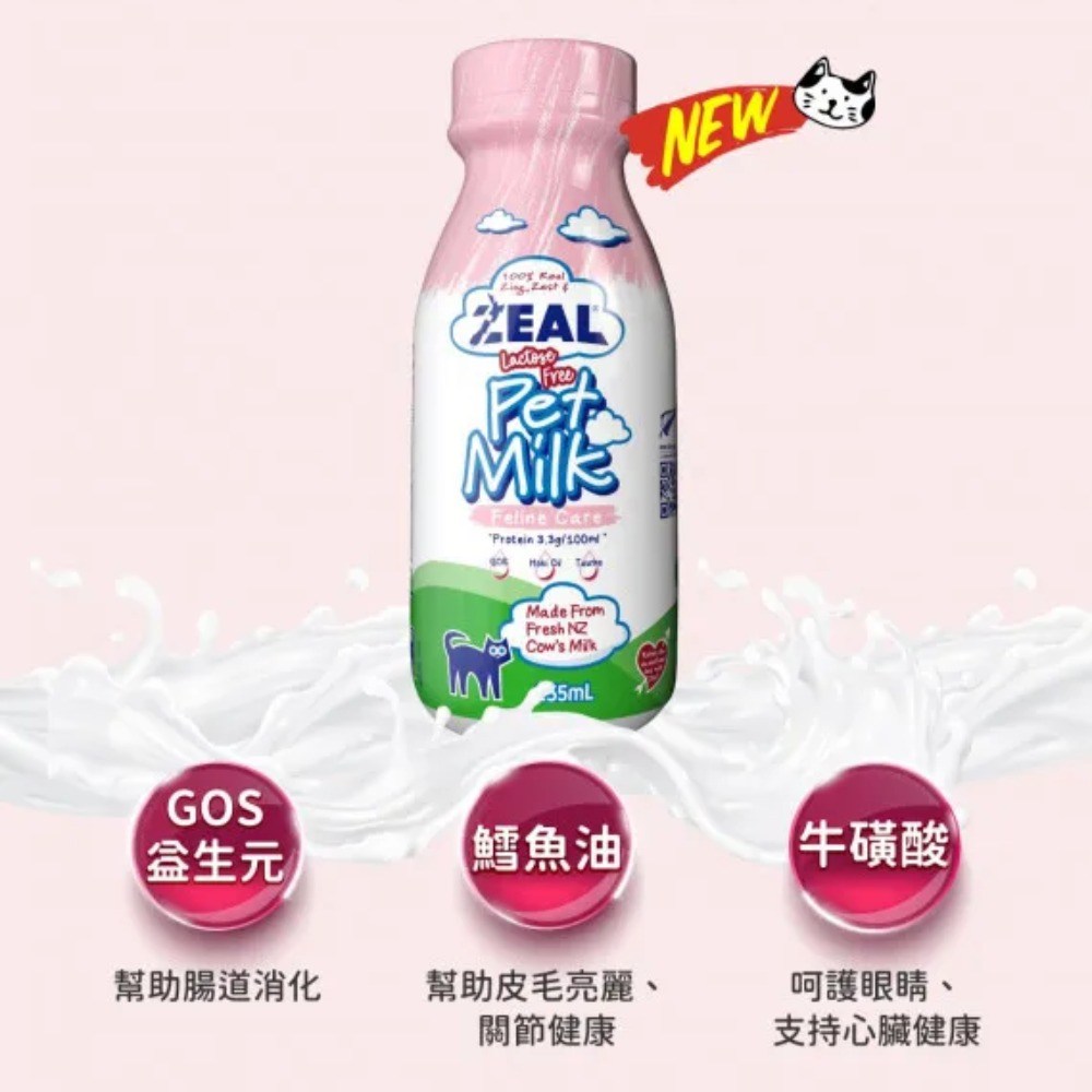 ZEAL真致紐西蘭貓用保健鮮乳,嚴選紐西蘭放牧草飼牛的新鮮乳製成,不含乳糖,讓貓咪輕鬆吸收無負擔。添加GOS益生元,有助於腸道消化,維持消化系統健康。更含有鱈魚油,幫助貓咪皮毛亮麗,關節更健康。此外,牛磺酸的添加,能有效呵護貓咪的眼睛、腦部與心臟機能。這款鮮乳適合所有生命階段的貓咪,是兼顧美味與健康的理想選擇。