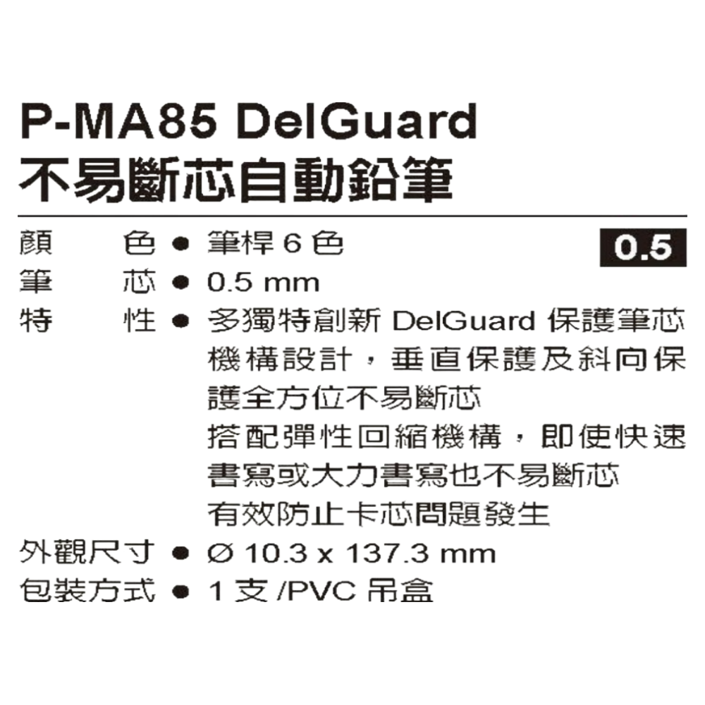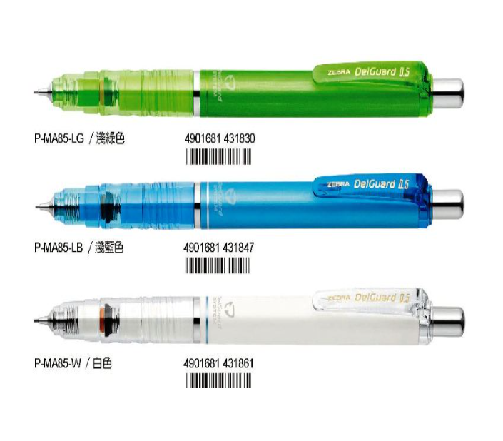 ZEBRA PMA85 0.5不易斷芯自動鉛筆,藍色,是您書寫的最佳選擇。這款自動鉛筆採用獨特的DelGuard不易斷芯技術,無論垂直或傾斜角度書寫,都能有效保護筆芯,減少斷裂困擾。0.5mm的筆芯粗細,適合日常書寫、繪圖等用途,筆觸流暢清晰。藍色筆身設計簡約時尚,握感舒適,讓您長時間書寫也不易疲勞。頂按式操作方便快捷,是學生、上班族不可或缺的文具好幫手。