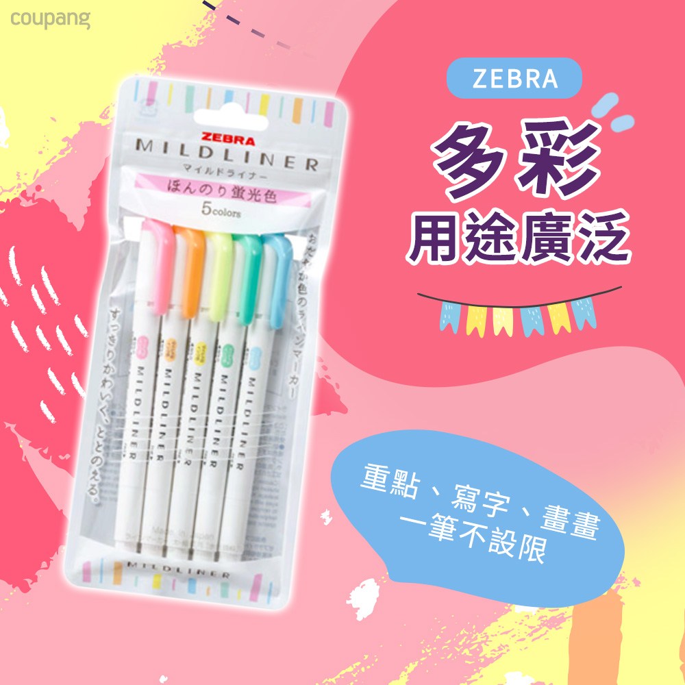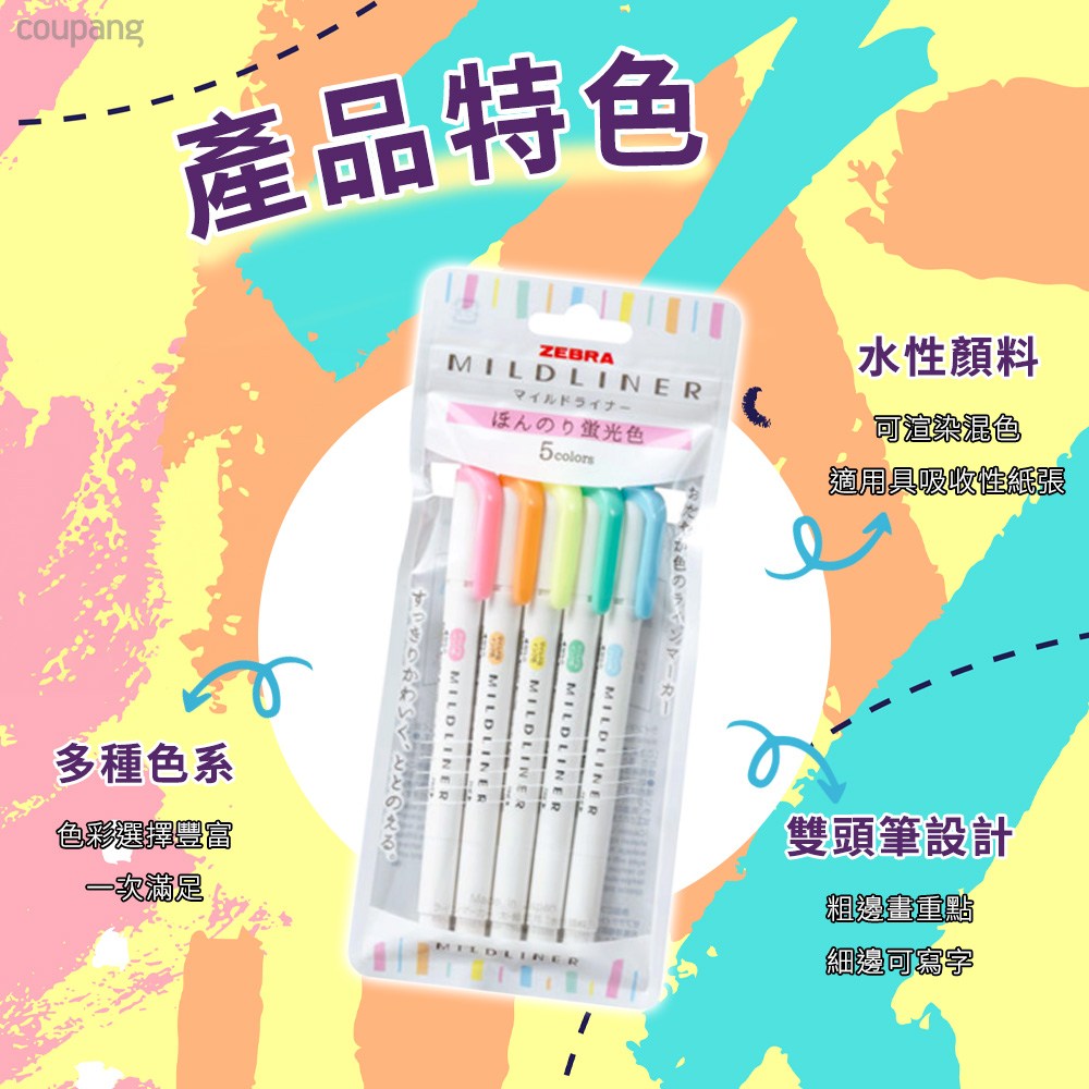 ZEBRA斑馬牌MILDLINER雙頭螢光筆組,提供多種柔和淡雅的色彩選擇,讓您的筆記重點更加清晰且賞心悅目。雙頭設計,粗細筆尖可隨意切換,滿足您在不同場合的使用需求,無論是重點標記、細字書寫或繪畫創作,都能輕鬆應對。水性顏料適用於多種紙張,色彩可渲染混色,讓您的作品更具層次感。此套組包含藍色、淺綠色、黃色、橘色和粉紅色,一次滿足您對色彩的需求,讓您的生活更加豐富多彩。讓您的筆記和創作充滿活力。