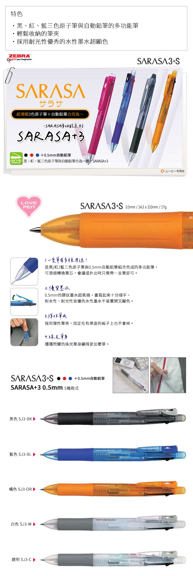 - 斑馬牌SARASA多功能筆結合黑、紅、藍三色原子筆,書寫色彩豐富多樣。