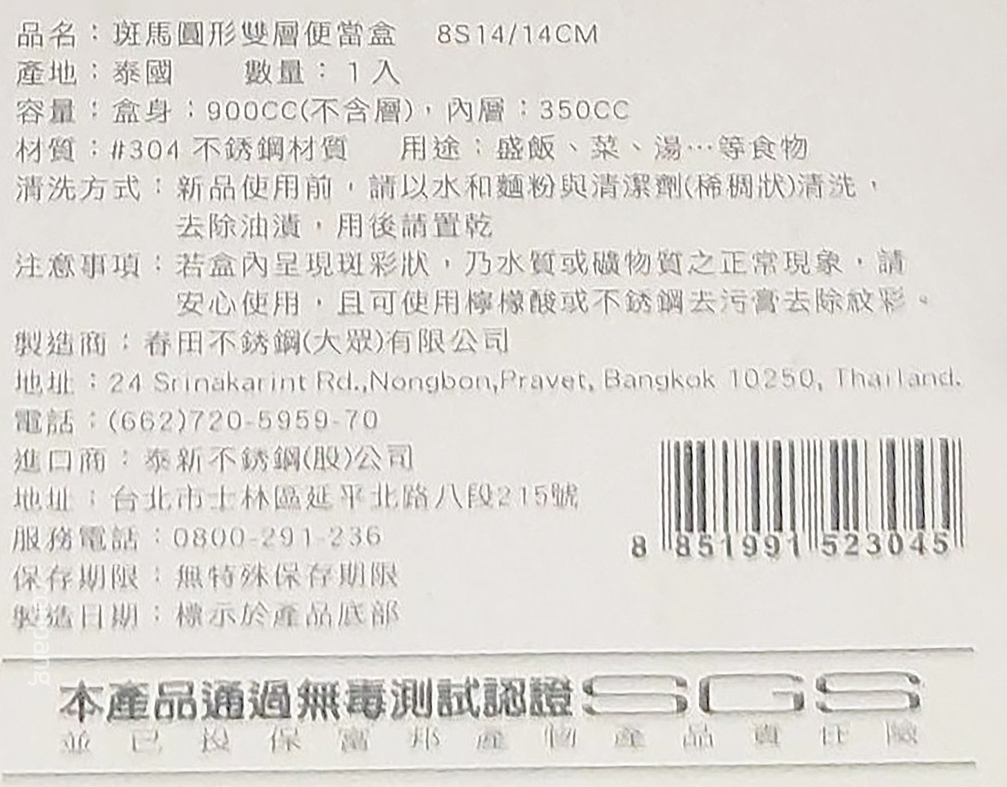 ZEBRA THAILAND 斑馬牌圓型雙層便當盒,讓您輕鬆攜帶美味餐點。這款14公分的便當盒,採用優質SUS 304不鏽鋼材質,讓您安心使用。盒身容量900cc,內層350cc,雙層設計可分隔飯菜,保持食物原味。圓形外觀簡約時尚,易於清洗,是您上班、上學、野餐的最佳選擇。斑馬牌自1966年以來,以其卓越品質和精湛工藝贏得信賴,為您提供舒適奢華的用餐體驗。