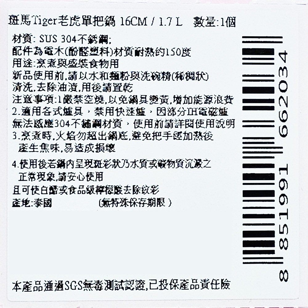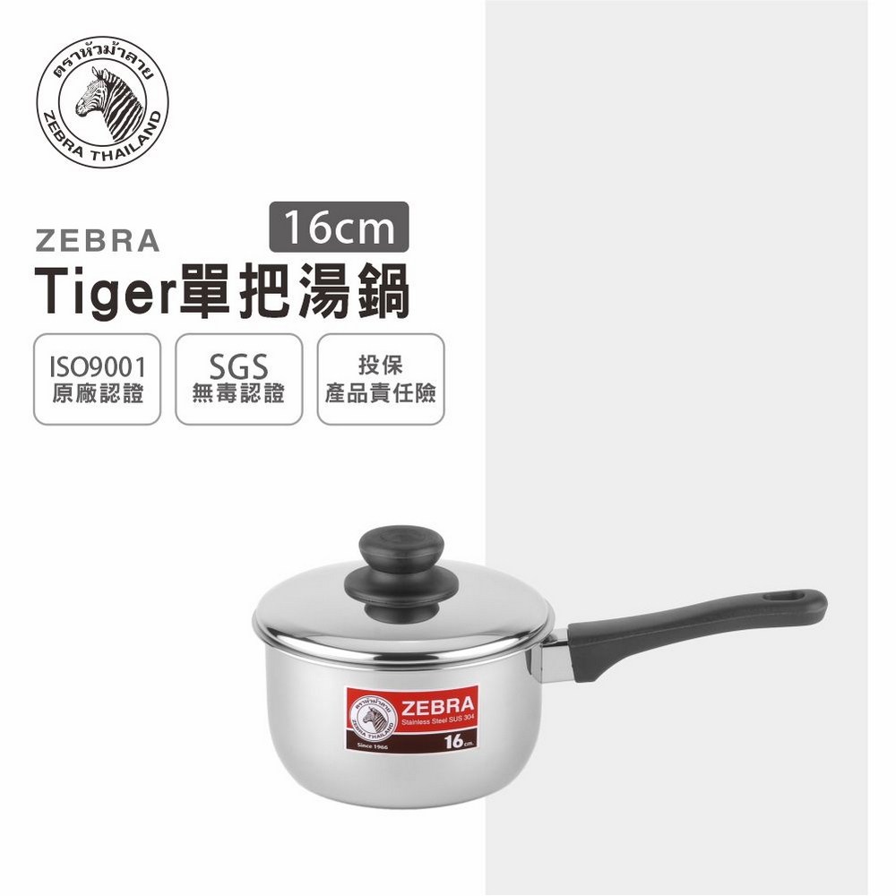 ZEBRA THAILAND Tiger老虎單把鍋,採用SUS 304不鏽鋼材質,堅固耐用且安全衛生。16公分直徑和1.7公升容量,適合小家庭或單身貴族使用,輕鬆烹煮各式料理。單柄設計方便拿取,附鍋蓋保持食物溫度,讓您隨時享用美味佳餚。無論是煮湯、熱牛奶或烹調簡單菜色,這款單把鍋都能滿足您的需求。不適用電磁爐,但適用於多種爐具,是您廚房裡不可或缺的好幫手。