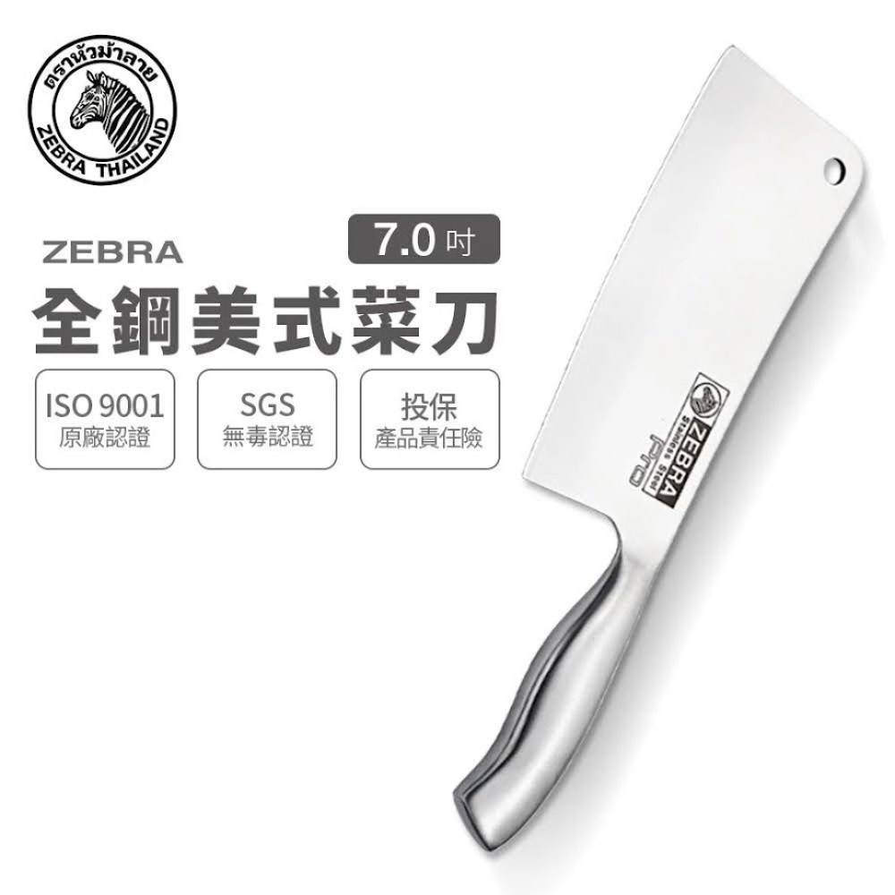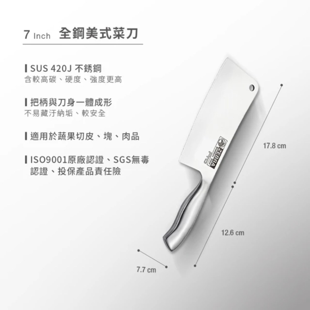 斑馬牌420不鏽鋼全鋼美式菜刀,採用優質不鏽鋼材,硬度及強度更高,讓您在料理時更加得心應手。一體成形的設計,避免藏汙納垢,使用更安心衛生。適用於蔬果切皮、切塊以及肉品處理,功能多元。通過ISO9001原廠認證及SGS無毒認證,並投保產品責任險,品質有保障。無論是專業廚師或家庭主婦,都能輕鬆駕馭。