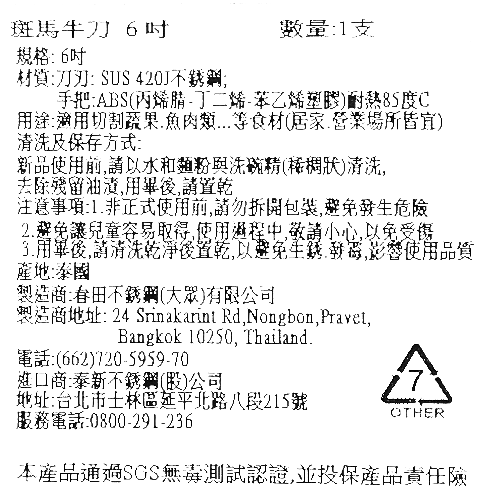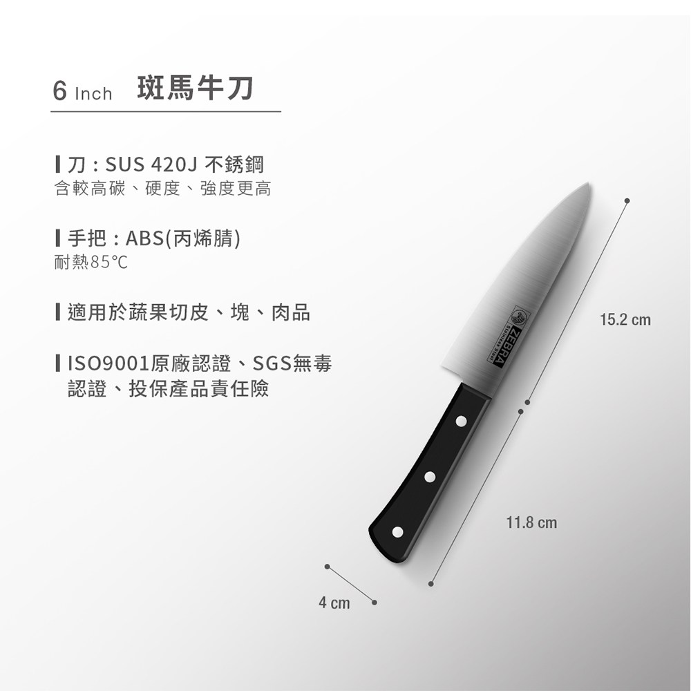 斑馬牌420不鏽鋼牛刀是一款適用於居家及營業場所的理想刀具。6吋刀身設計,精巧易用,能輕鬆切割蔬果、魚肉等食材。刀刃採用SUS420J不鏽鋼,鋒利耐用,手柄則使用耐熱ABS材質,握感舒適安全。使用前請清洗乾淨,用畢後置於乾燥處,避免生鏽。本產品通過SGS無毒測試認證,並已投保產品責任險,讓您使用。