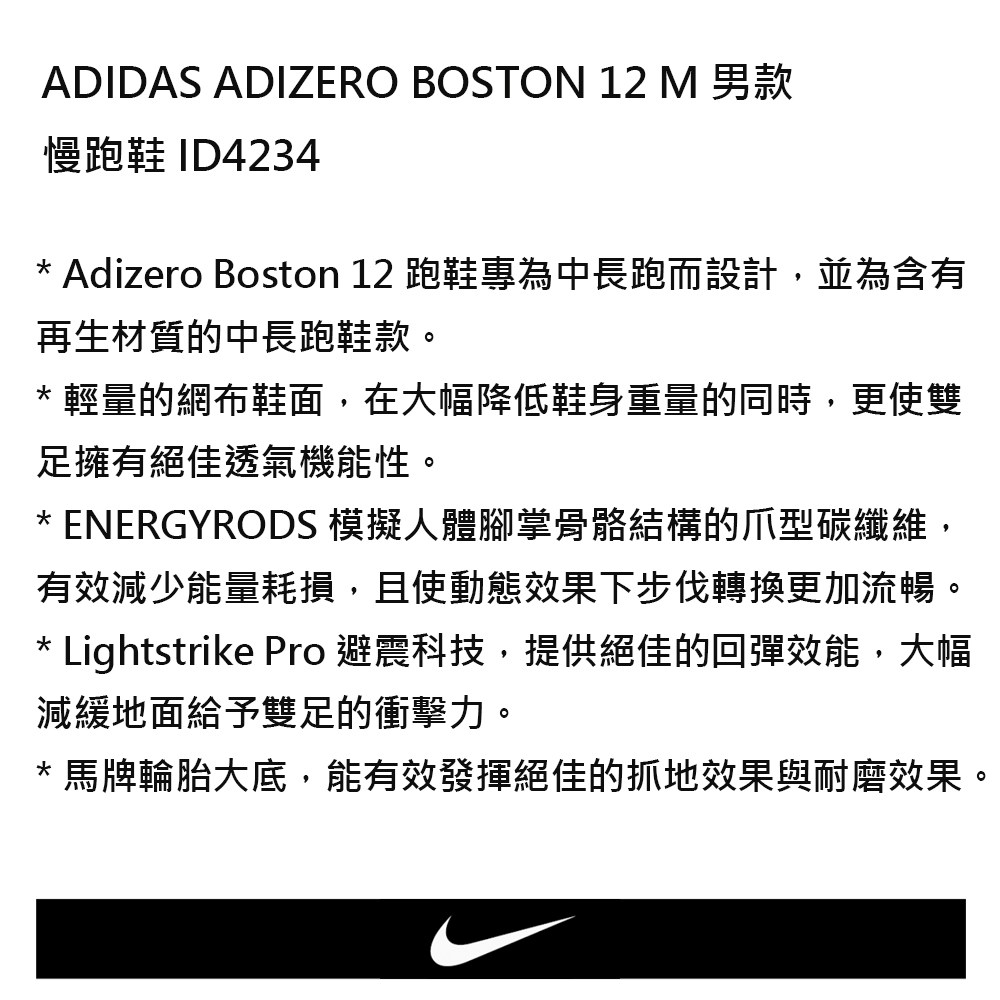ADIDAS ADIZERO BOSTON 12 M 男款慢跑鞋專為追求速度與舒適度的跑者設計。這款跑鞋採用輕量化材質,提供卓越的能量回饋和推進力,助您輕鬆應對各種跑步挑戰。鞋面透氣網布設計,確保雙腳在運動過程中保持乾爽舒適。耐磨大底提供出色的抓地力,讓您在不同路面上都能穩定奔跑。無論是日常訓練還是比賽,ADIZERO BOSTON 12 M 都是您的理想之選。