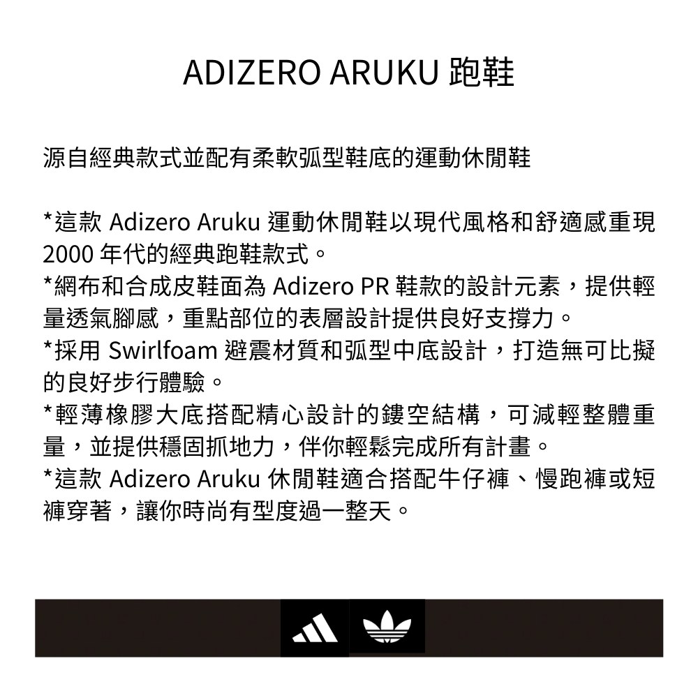 這款ADIDAS ADIZERO ARUKU跑鞋,以經典款式為基礎,結合柔軟弧型鞋底,打造運動休閒風格。網布與合成皮鞋面提供輕盈透氣感,重點部位的表層設計加強支撐力。Swirlfoam避震材質與弧型中底設計,帶來舒適的步行體驗。輕薄橡膠大底搭配鏤空結構,減輕整體重量,提供穩固抓地力。適合搭配牛仔褲、慢跑褲或短褲,展現時尚有型的一面。