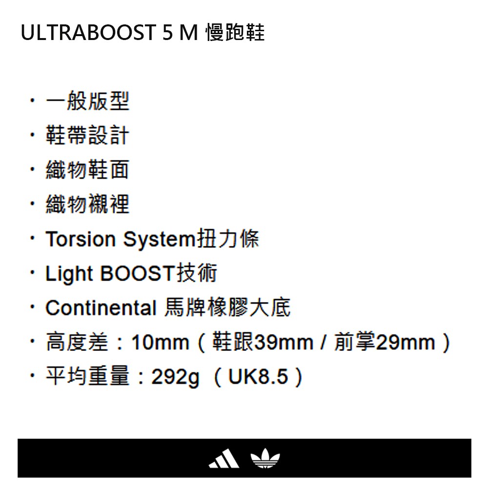 - ULTRABOOST 5 M 慢跑鞋採用織物鞋面與襯裡,提供絕佳透氣性與舒適度,適合長時間穿著運動。