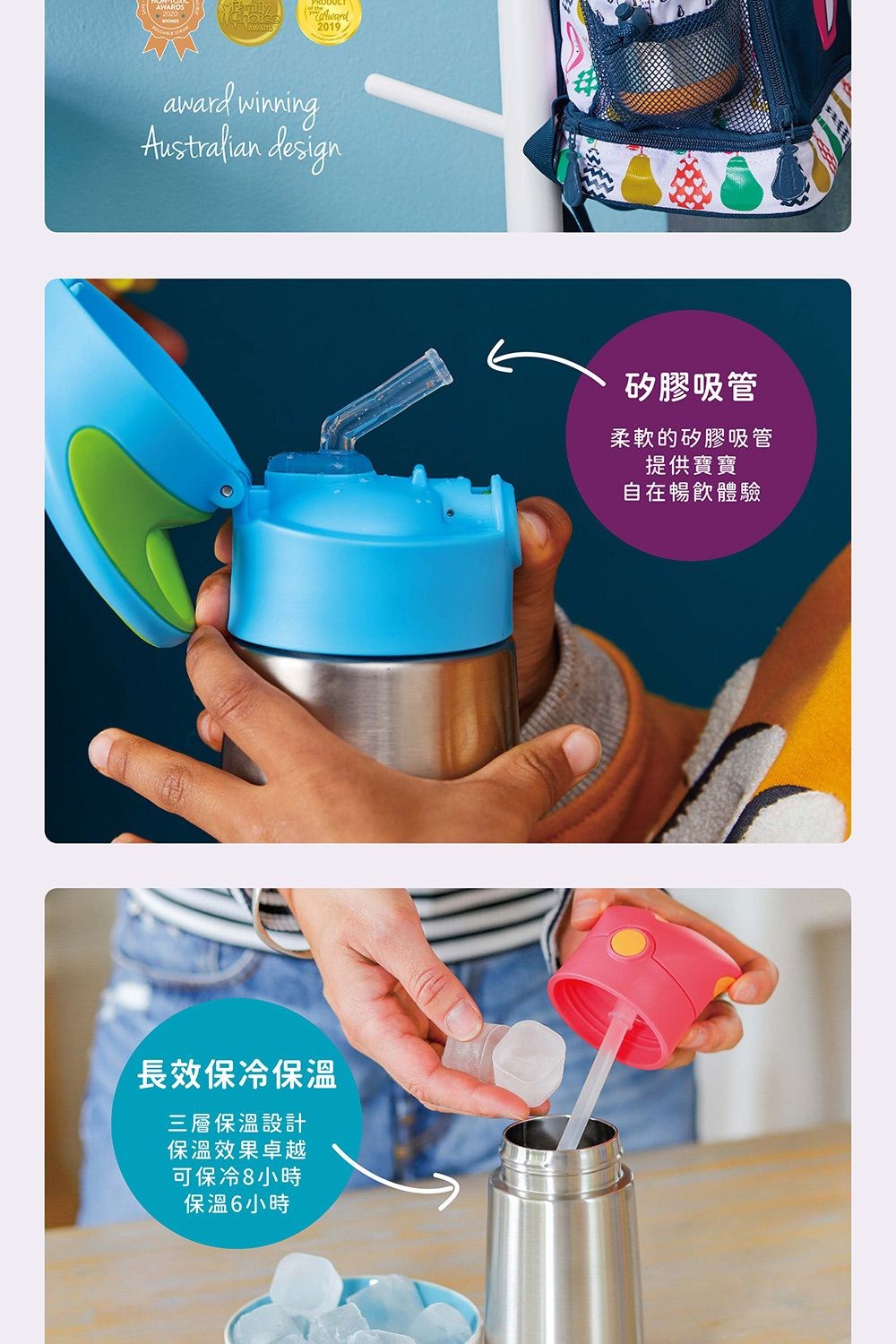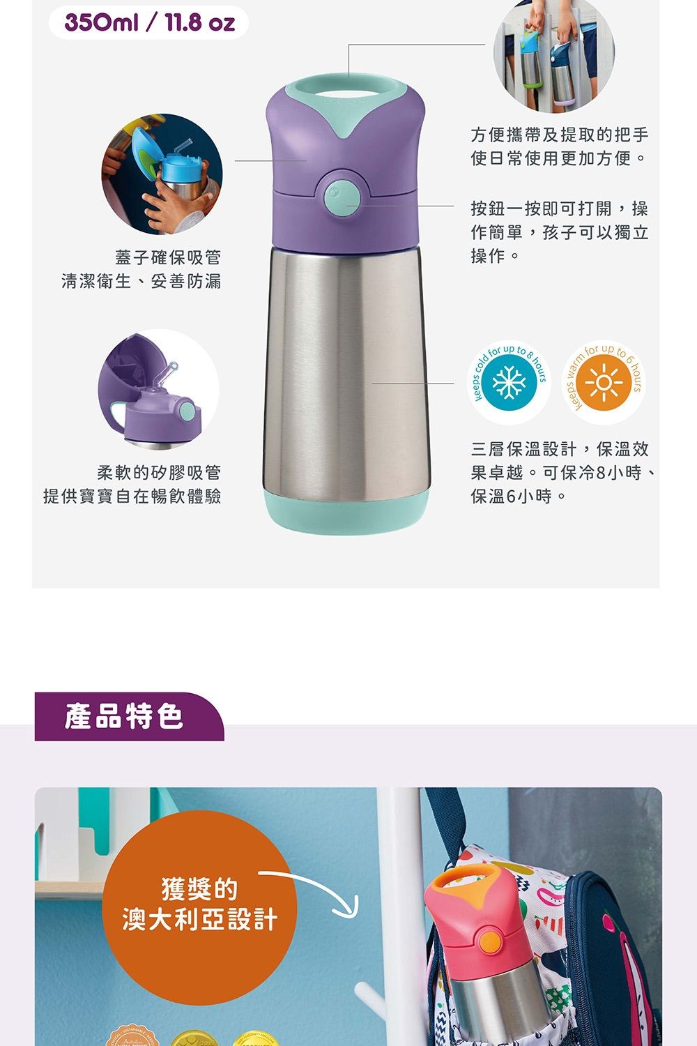 - 雙層不鏽鋼保冷杯,持久保溫保冷,讓孩子隨時享受適溫飲品,外出也能輕鬆補充水分。