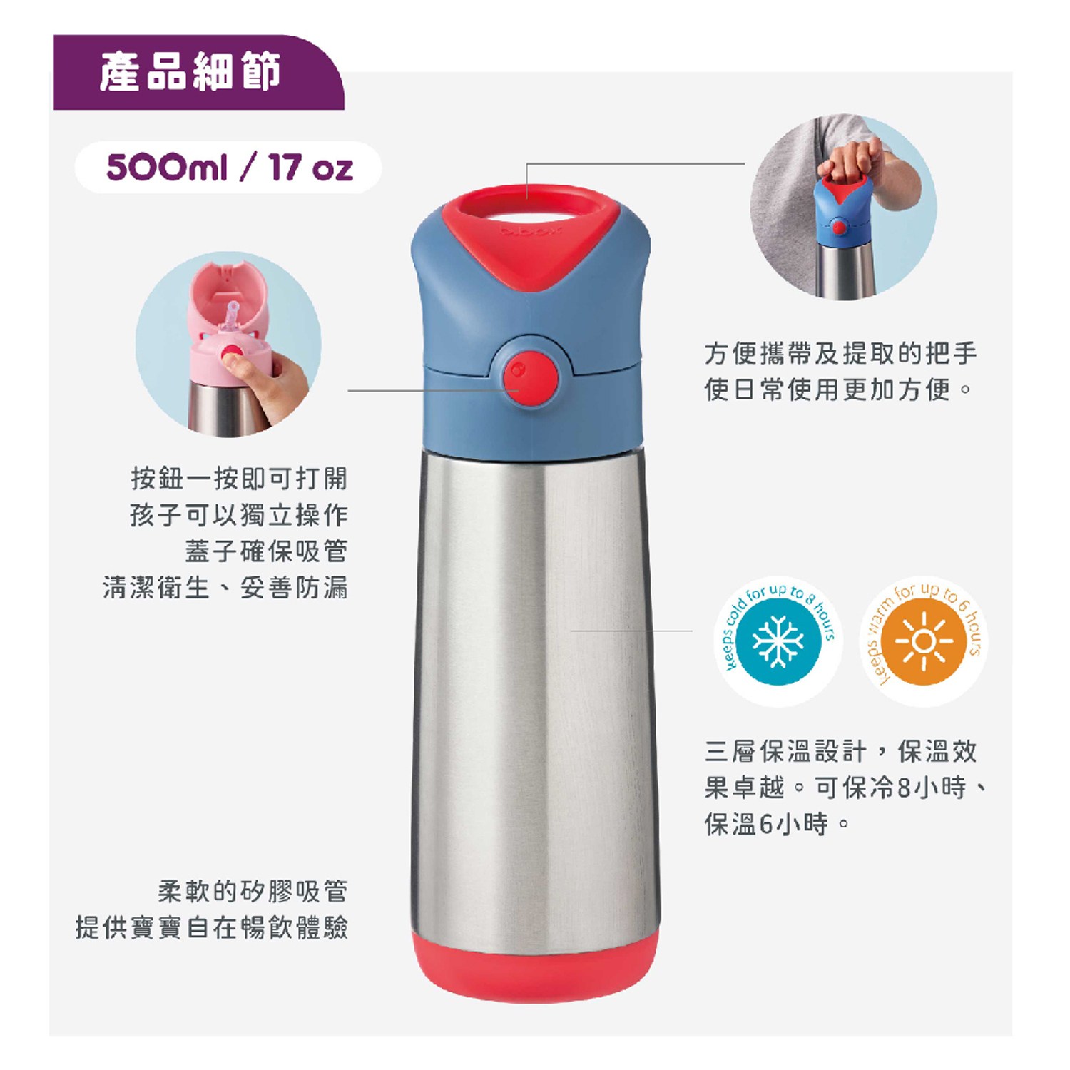b.box不鏽鋼吸管保冷水壺是一款專為孩子們設計的飲水用具。採用優質不鏽鋼材質,堅固耐用,讓家長們可以放心使用。500ml的容量設計,滿足孩子們一天的飲水需求,讓他們隨時補充水分,保持活力。藍色超人造型,色彩鮮豔,吸引孩子們的目光,讓他們愛上喝水。吸管設計方便孩子們飲用,避免嗆水,讓他們可以輕鬆自在地享受飲水的樂趣。保冷保溫功能,讓孩子們在不同季節都能喝到適溫的飲品,呵護他們的健康。