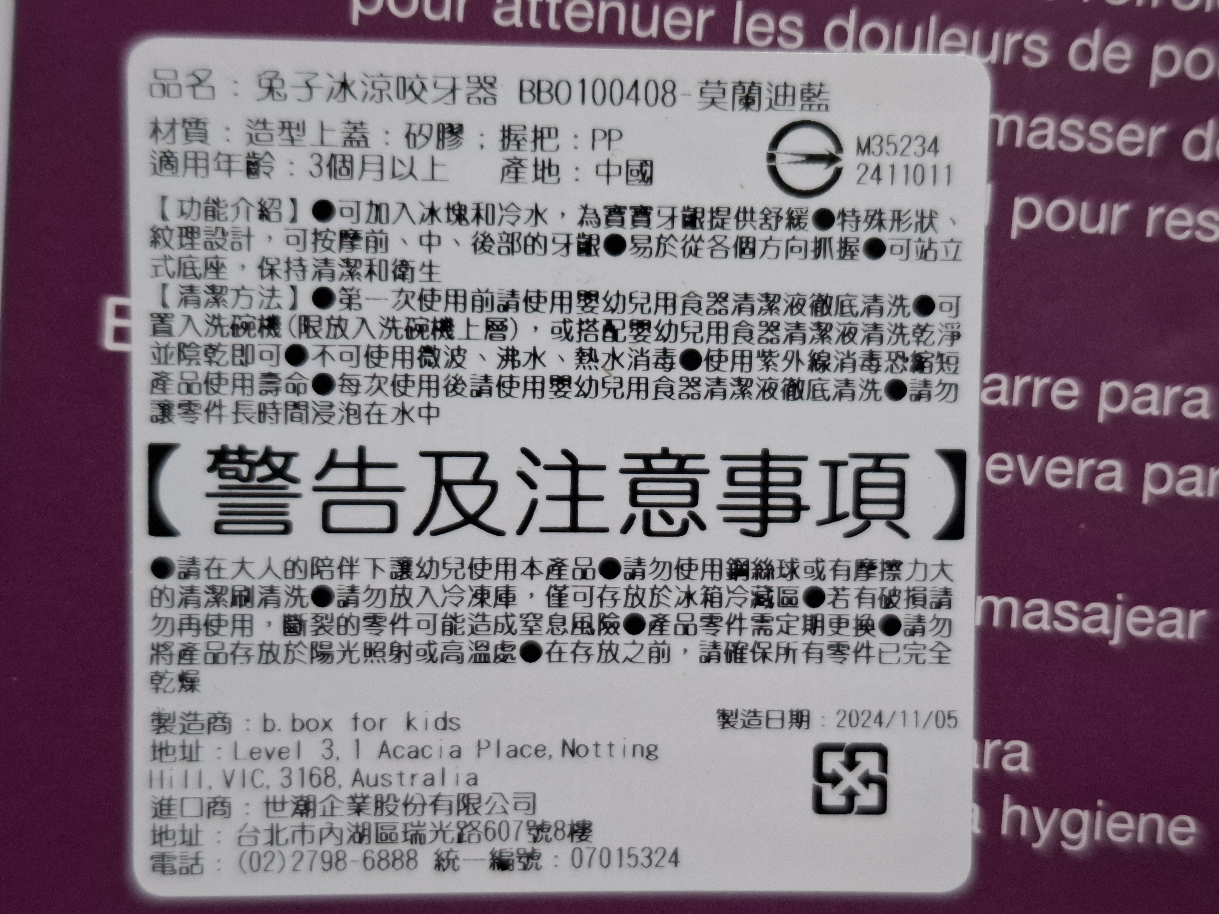 b.box 澳洲兔子冰涼咬牙器,莫蘭迪藍色,給寶寶帶來舒緩的體驗,讓寶寶可以安心啃咬,幫助舒緩長牙時的不適。獨特的兔子造型設計,搭配多種紋理,能有效按摩寶寶的牙齦,促進口腔發展。冰涼效果更能加強舒緩感,只需放入冰箱冷藏片刻即可。b.box 品牌以其高品質和創新設計而聞名,是媽媽們信賴的選擇。