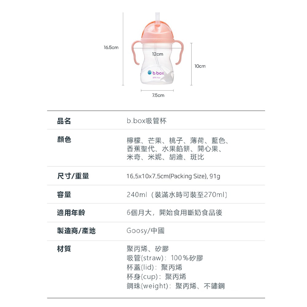b.box 升級款防漏水杯,專為6個月以上寶寶設計,讓寶寶學習自主喝水。獨特的加重吸管設計,無論哪個角度都能輕鬆暢飲,搭配防漏閥門,減少溢漏。杯身採用安全材質,不含BPA等有害物質,讓寶寶使用。易於抓握的把手設計,訓練寶寶手部肌肉發展,學習更輕鬆。清洗方便,可放置於洗碗機上層清洗,省時省力。