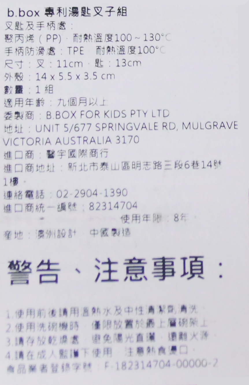 - 餐具材質: 叉匙及手柄處:聚丙烯(PP),耐熱溫度:100C〜130% 手柄防滑處:TPE,耐熱温度:100%