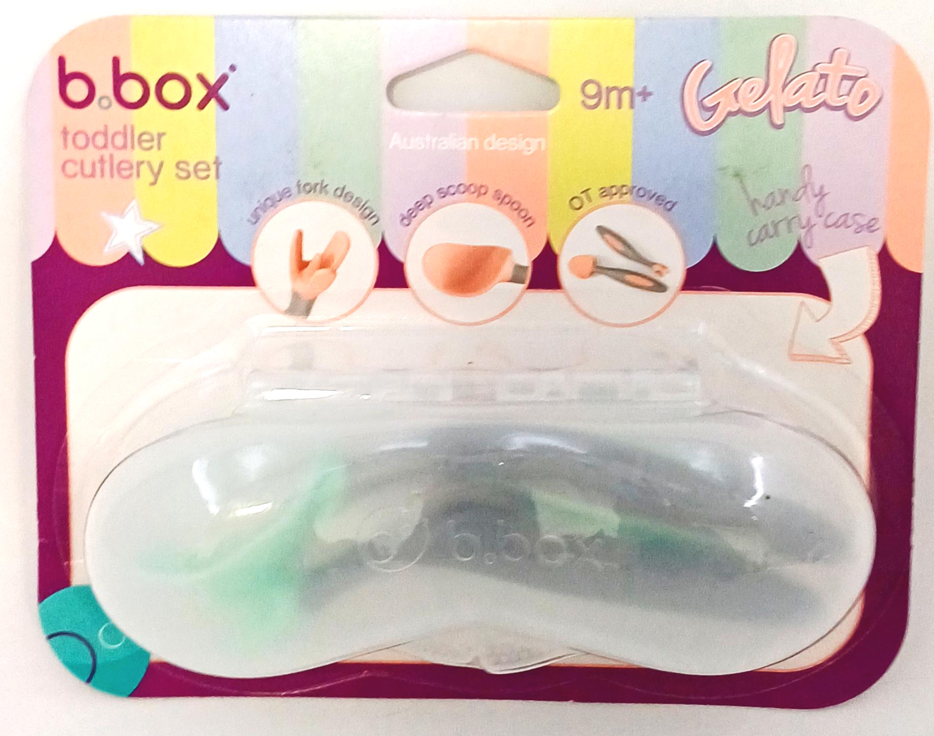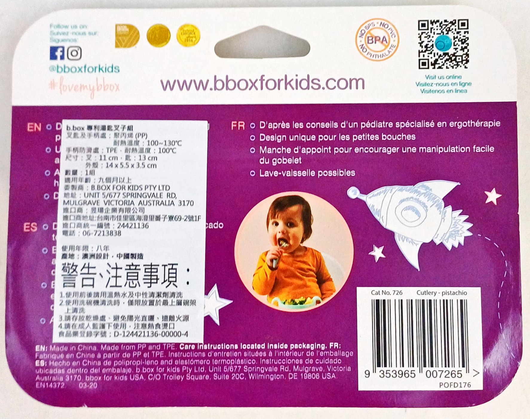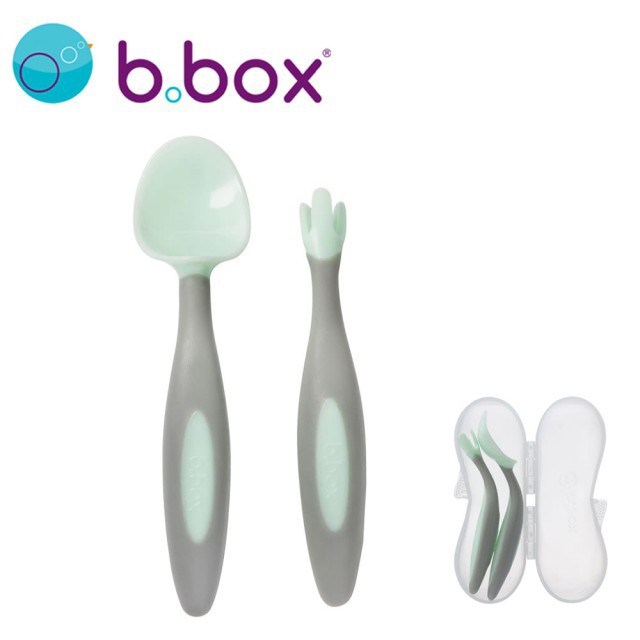 b.box 專利湯匙叉子組,馬卡龍綠色系,包含湯匙和叉子各一支,是專為寶寶設計的餐具好幫手,不含BPA、雙酚A及PVC塑化劑,讓寶寶安心使用。特殊專利的大頭叉與深勺湯匙設計,讓寶寶更容易學習自己吃飯,增加用餐樂趣和成就感。獨特的叉子設計,大小和形狀都經過精心設計,適合寶寶的小嘴。使用後可放入洗碗機清洗,方便又衛生,讓媽媽輕鬆省力。