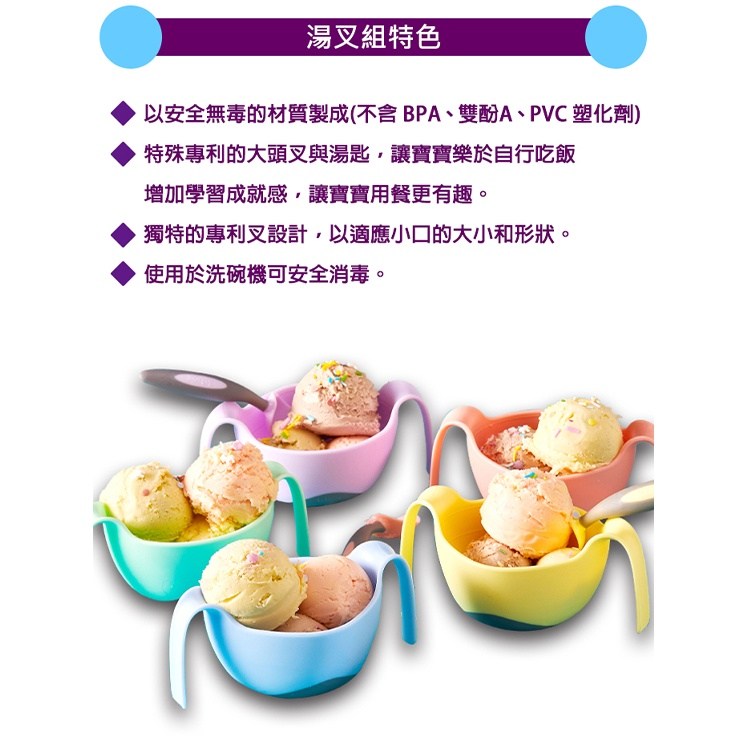 - 特色: 以安全無毒的材質製成(不含 BPA、雙酚A、PVC塑化劑) 特殊專利的大頭叉與湯匙,讓寶寶樂於自行吃飯 增加學習成就感,讓寶寶用餐更有趣。 獨特的專利叉設計,以適應小口的大小和形狀。 使用於洗碗機可安全消毒。