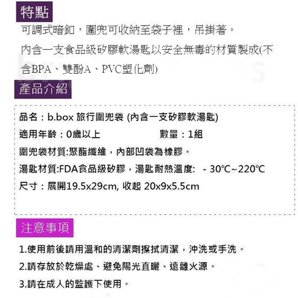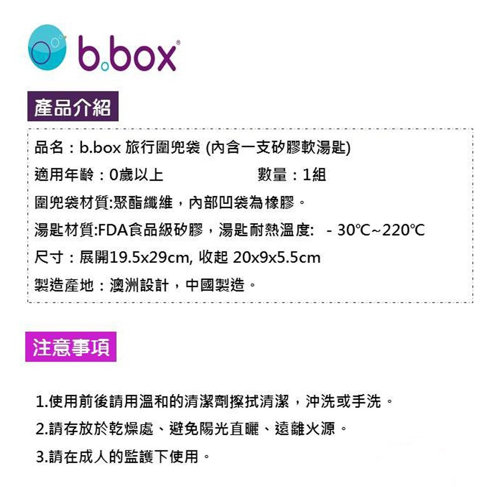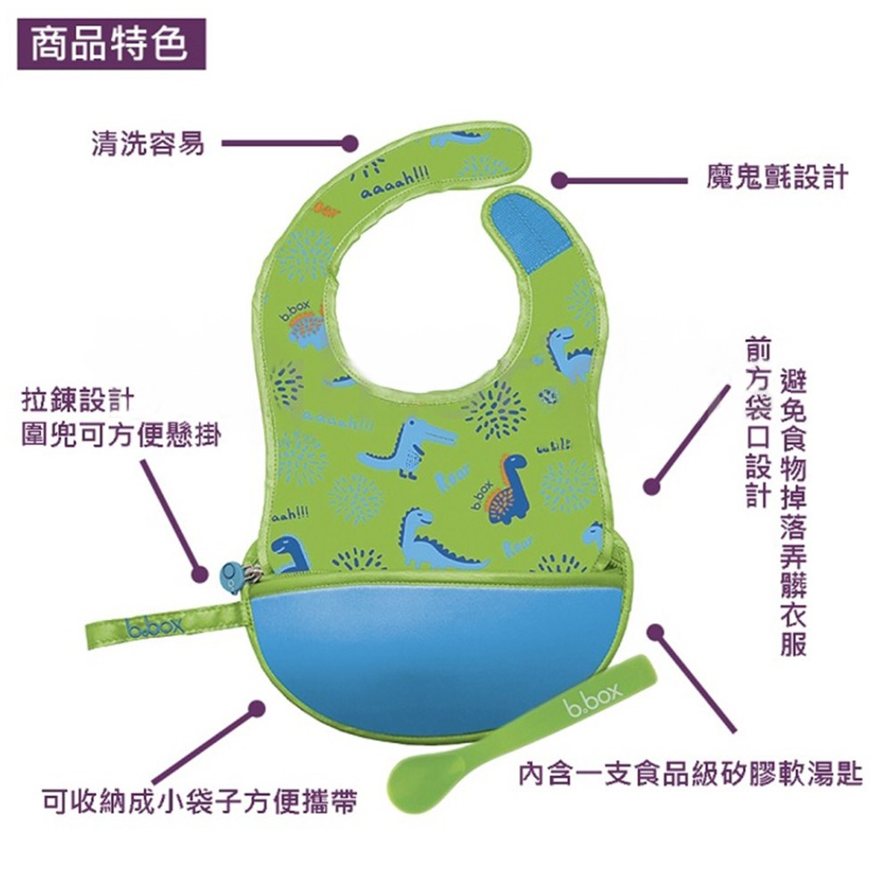 b.box 澳洲旅行圍兜袋,小恐龍圖案,讓寶寶用餐時光充滿樂趣!這款圍兜採用防潑水聚酯纖維材質,易於清潔,讓媽媽輕鬆應對寶寶的食物掉落。魔鬼氈項圈設計方便穿脫,尺寸為19.5 x 29cm,展開後提供足夠的覆蓋範圍,有效保護寶寶的衣物。獨特的旅行圍兜設計可摺疊收納,方便攜帶,附帶的矽膠軟湯匙讓外出餵食更加便利。小恐龍圖案色彩鮮明,吸引寶寶的注意力,讓用餐時光更加愉快。這款圍兜僅限手洗,請注意清潔方式。
