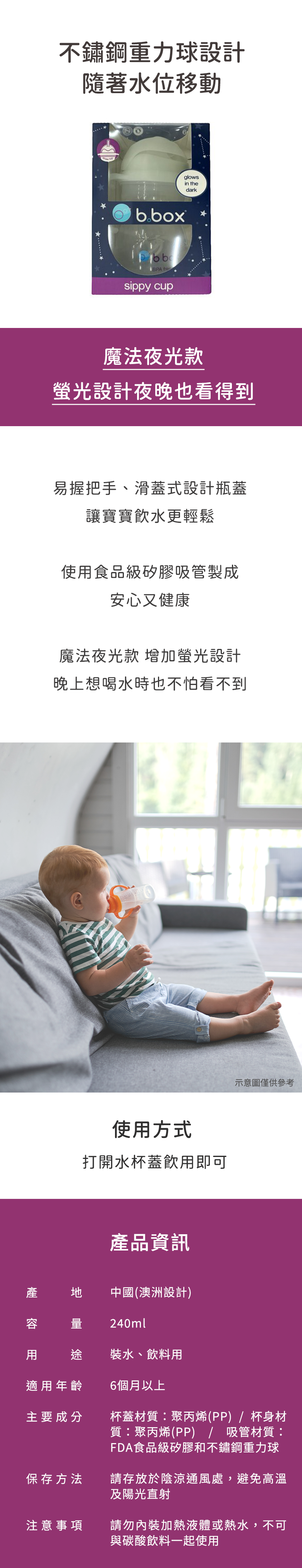 - 夜光材質讓寶寶在黑暗中也能輕鬆找到水杯,安心飲用,不再害怕夜晚。