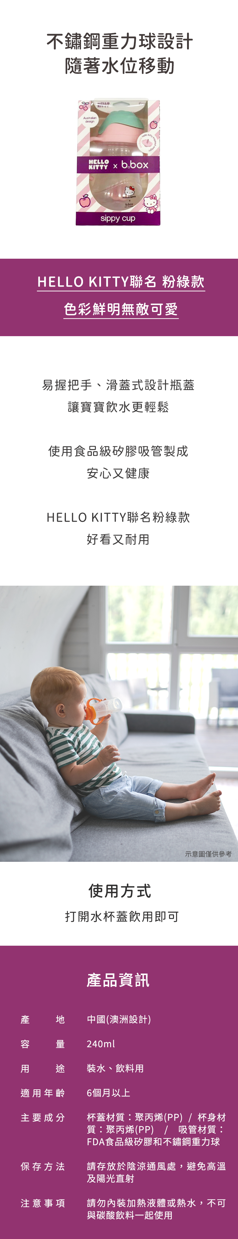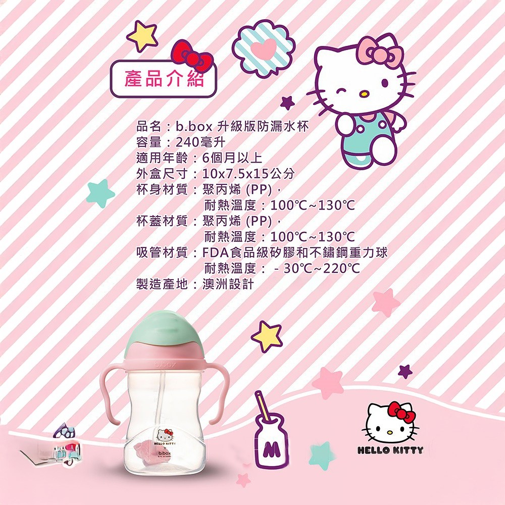 這款b.box澳洲HELLO KITTY重力球吸管杯,以粉綠色調和可愛的HELLO KITTY設計,容量240ml,專為6個月以上的寶寶設計。獨特的重力球設計,讓寶寶在任何角度都能輕鬆吸吮,易於抓握的杯身設計,方便寶寶自主飲用,不含BPA,讓媽媽更安心。杯身、杯蓋採用聚丙烯(PP)材質,吸管則採用食用級矽膠和不銹鋼重力球,耐熱溫度範圍廣,易於清潔,可用洗碗機清洗(限上層)和消毒器消毒。此外,我們還提供HELLO KITTY替換吸管+清潔刷套組,方便您隨時更換和清潔。