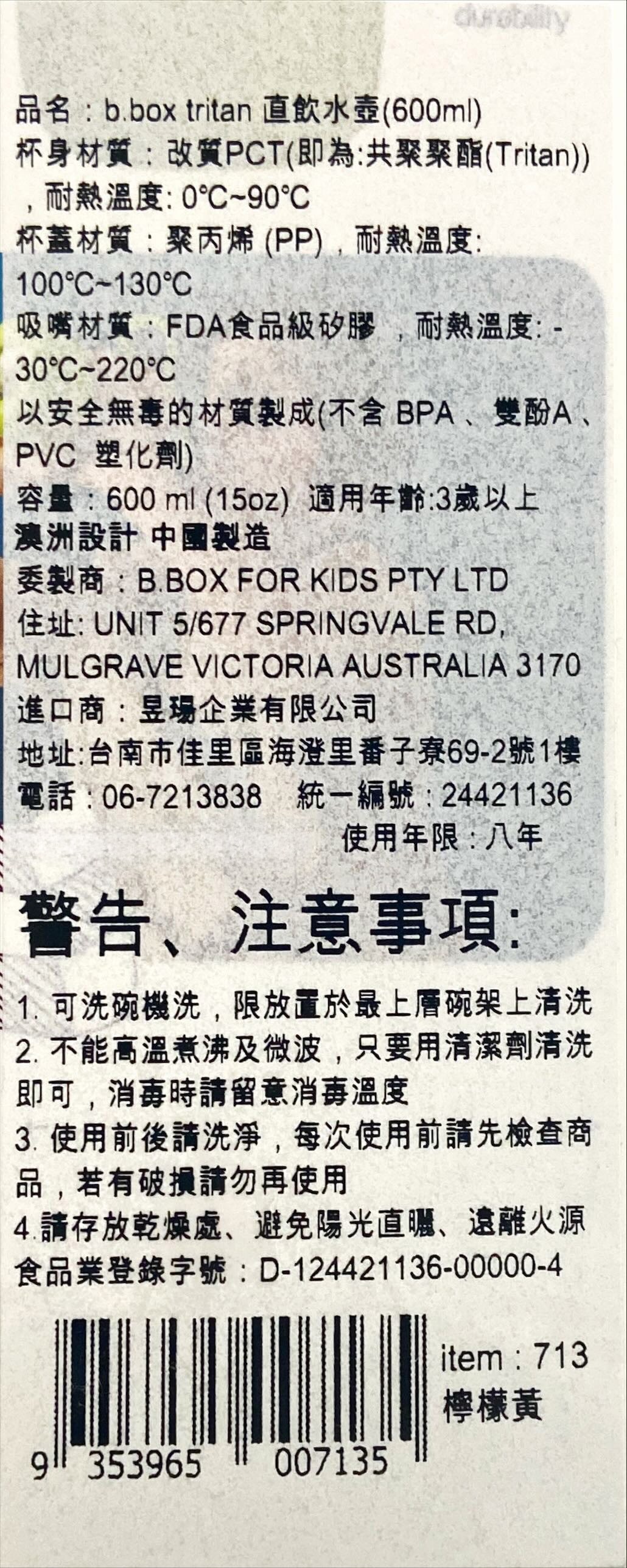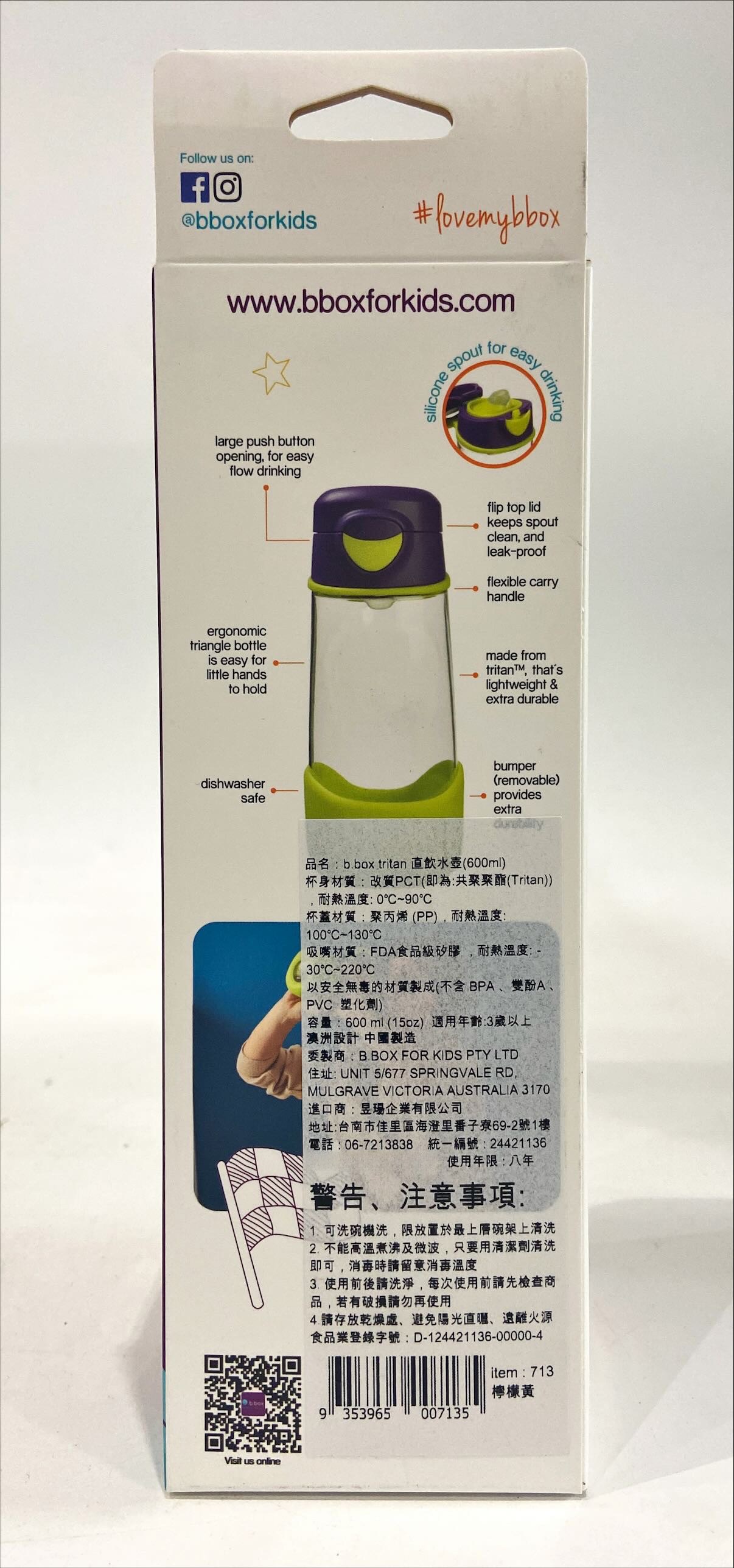 這款 b.box 澳洲 Tritan 直飲水壺,檸檬黃色,容量 600ml,是專為孩子設計的理想水壺。採用高品質 Tritan 材質,不含 BPA,讓孩子安心飲用。水壺設計輕巧耐用,適合 3 歲以上的兒童使用,無論在家或外出,都能方便攜帶。獨特的直飲設計,讓孩子輕鬆補充水分,養成良好的飲水習慣。此外,這款水壺適用於洗碗機清洗,方便家長清潔,省時省力。