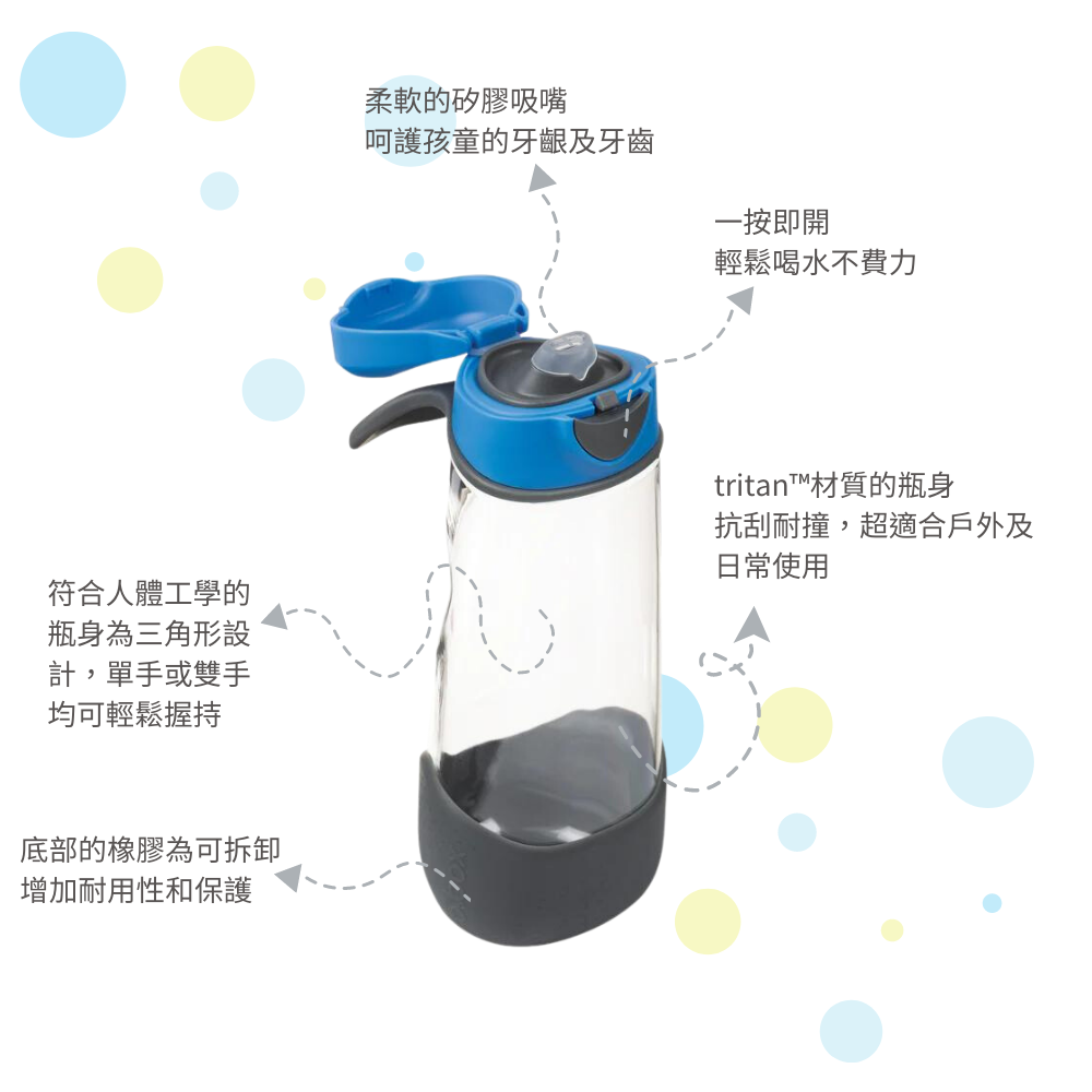 - - Tritan材質瓶身堅固耐用,防刮耐撞,適合戶外活動及日常使用,讓孩子隨時補充水分。