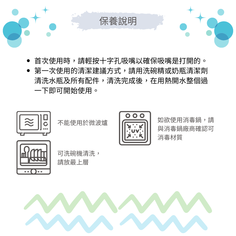 - - 柔軟矽膠吸嘴呵護寶貝的牙齦與牙齒,讓孩子在成長過程中也能舒適飲用。