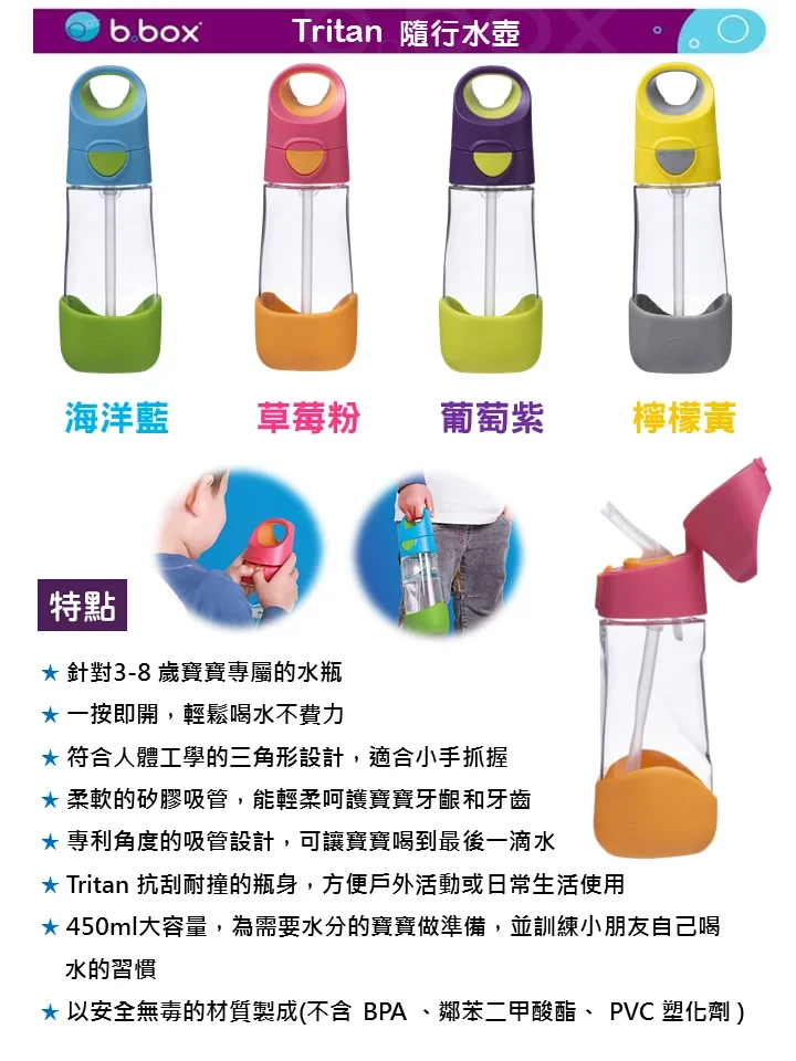 這款 b.box 澳洲 Tritan 隨行水壺,容量 450ml,讓孩子安心飲用。葡萄紫的時尚外觀,搭配符合人體工學的設計,方便孩子小手抓握,輕鬆帶著走。一鍵按壓開蓋設計,讓孩子輕鬆飲水,不再費力。無論上學、出遊,這款水壺都是孩子們的最佳選擇,讓他們隨時補充水分,保持活力。此外,水壺不含 BPA、磷苯二甲酸酯、PVC 塑化劑,媽媽們可以放心選購。