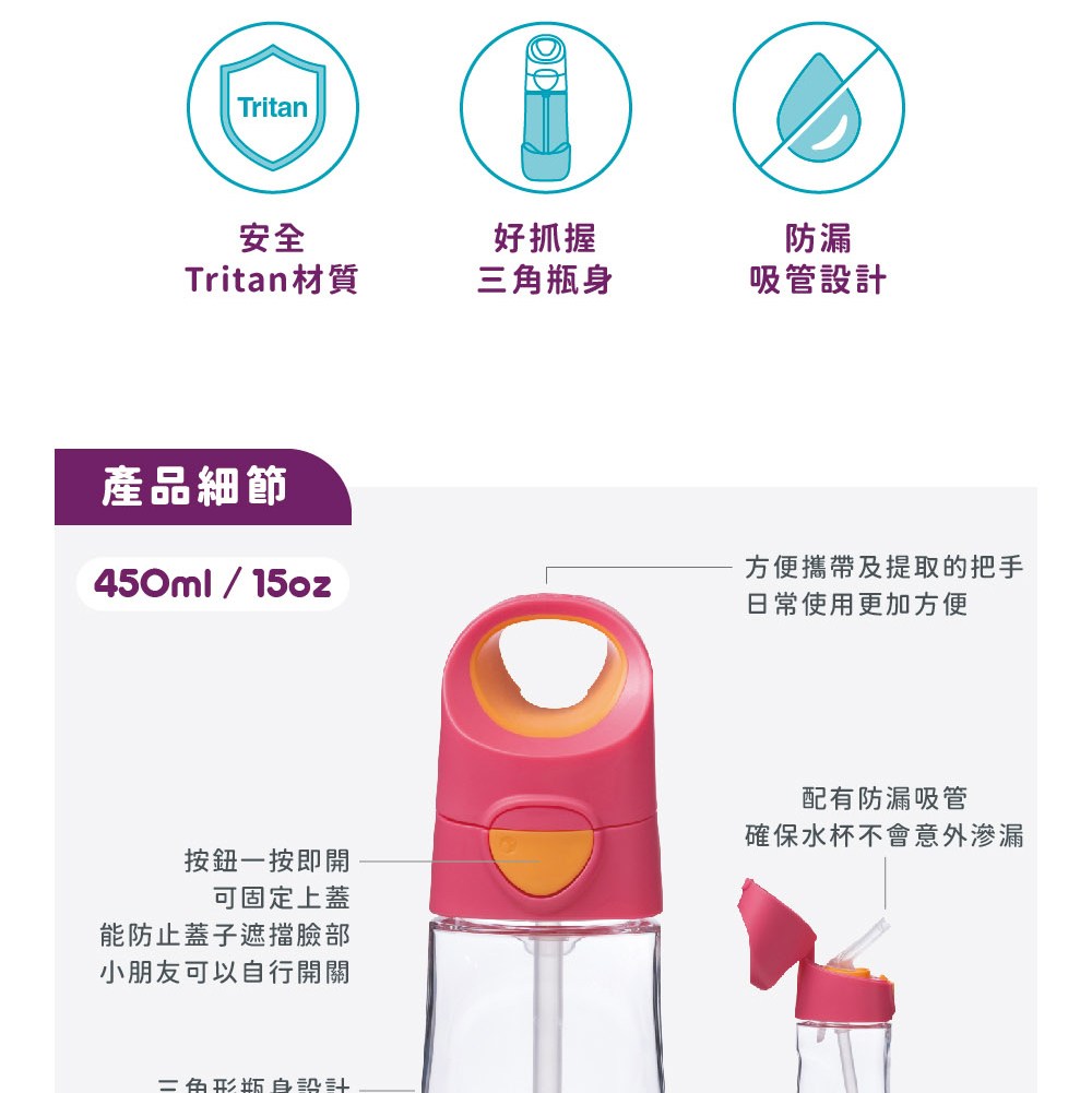 b.box 澳洲 Tritan 隨行水壺,草莓粉色,容量450ml,是專為3歲以上寶寶設計的理想水壺。採用堅固耐用的Tritan材質,不含BPA,讓孩子安心飲用。符合人體工學的三角形設計,方便小手抓握,培養孩子獨立飲水的好習慣。柔軟的矽膠吸管呵護寶寶的牙齦和牙齒,專利角度的吸管設計,讓寶寶輕鬆喝到最後一滴水。無論戶外活動或日常使用,這款隨行水壺都是寶寶的理想選擇。