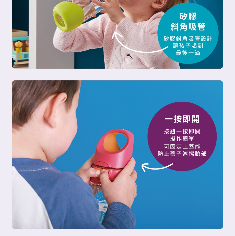 - - 一按即開的設計,讓孩子輕鬆打開水壺,隨時補充水分,無需費力操作。