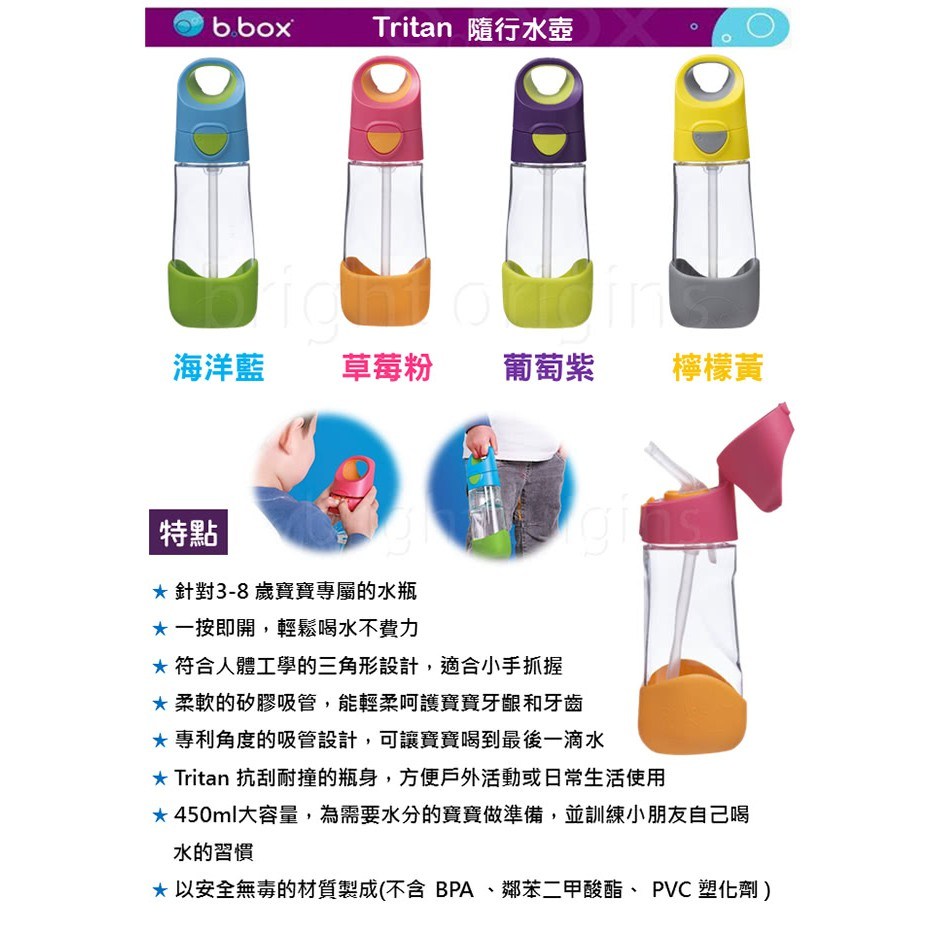 b.box 澳洲 Tritan 隨行水壺,以其耐用且安全的材質,成為孩子們理想的飲水夥伴。這款紫蘿蘭色的水壺容量為600ml,採用不含BPA的Tritan材質,確保飲用水的安全與純淨。聚丙烯(PP)和共聚聚酯(Tritan)的結合,使水壺既輕巧又堅固,適合孩子們日常攜帶和使用。獨特的設計包含瓶身、瓶蓋和吸管,方便孩子們輕鬆飲用,而手柄設計則讓他們更容易抓握。無論是在家、學校或戶外活動,b.box 隨行水壺都能讓孩子們隨時補充水分,保持活力。