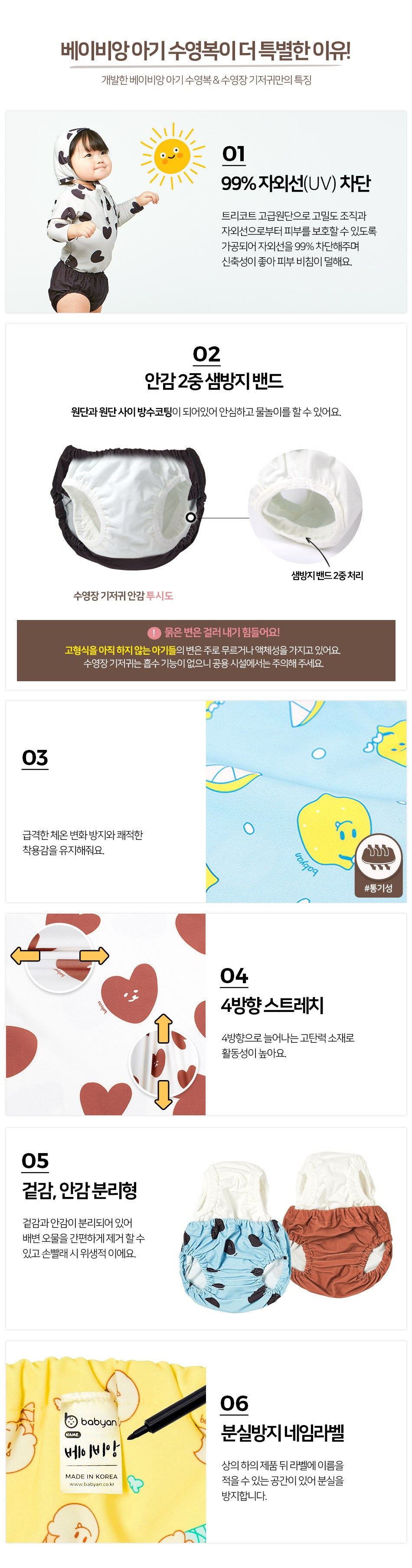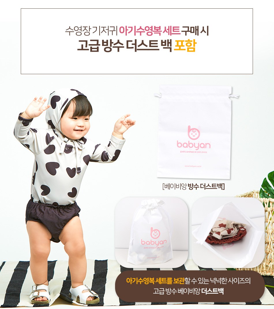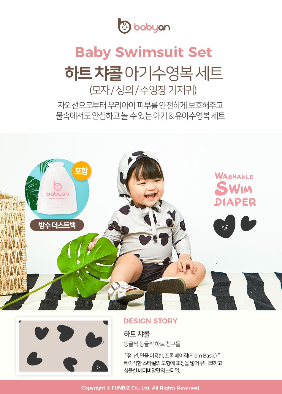 Babyan孩童可愛泳衣套裝,採用柔軟親膚材質,給寶寶帶來舒適的穿著體驗。此款泳衣具備防曬功能,有效阻擋紫外線,保護寶寶嬌嫩的肌膚,讓孩子在陽光下也能安心玩耍。炭灰色愛心款設計,可愛又時尚,讓您的寶貝成為海灘上最亮眼的小明星。套裝包含泳衣、泳褲及泳帽,並附贈高級防水防塵袋,方便收納與攜帶。Babyan堅持100%韓國國內生產,嚴格把關品質,讓您安心選購。