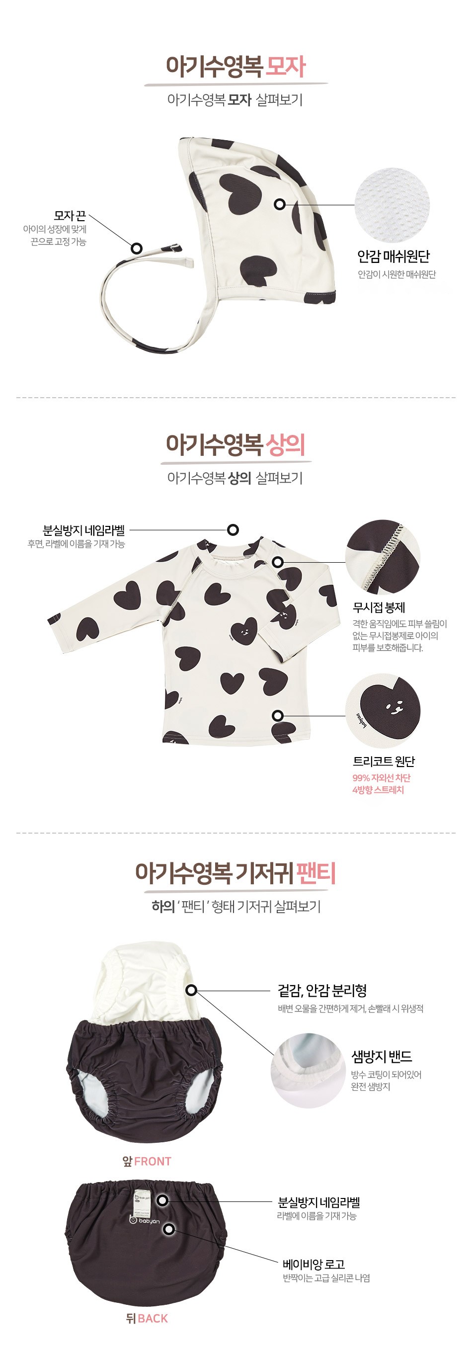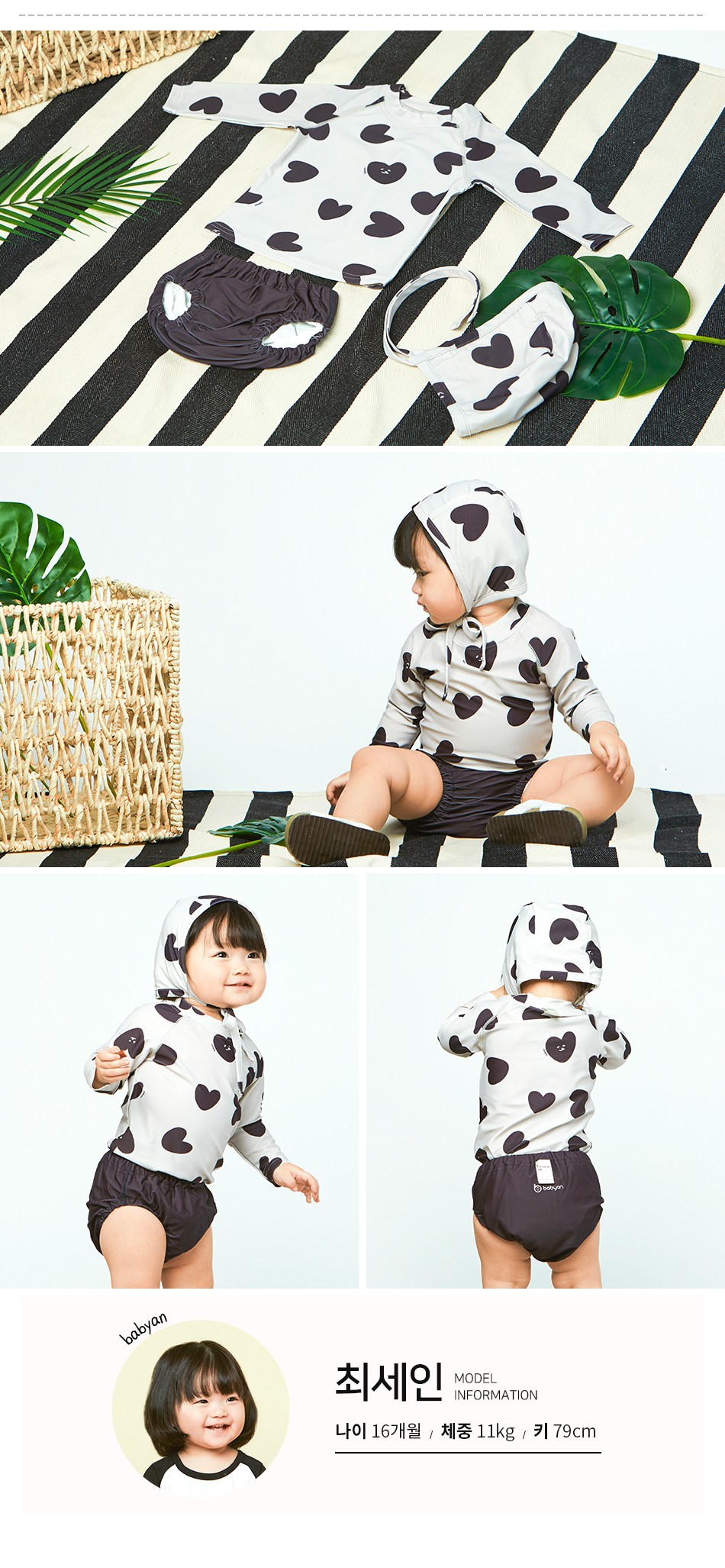 - 獨特設計可愛時尚,讓寶寶成為海灘焦點,炭灰色愛心圖案增添童趣,展現寶貝的獨特魅力。