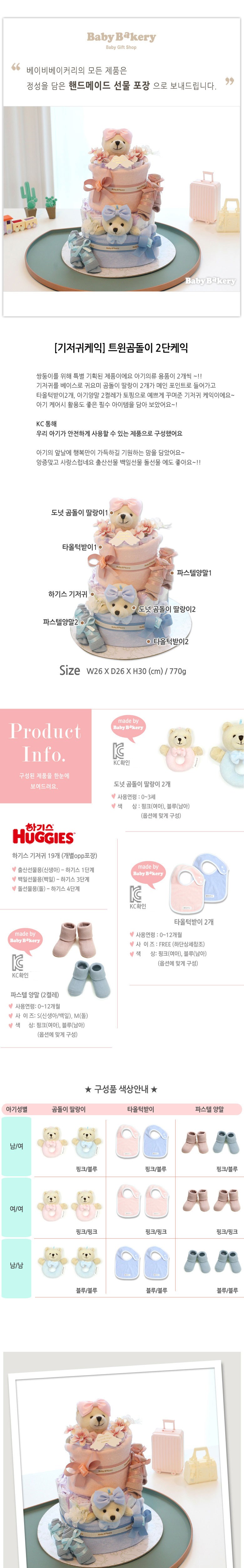 babybakery 嬰兒尿布蛋糕 雙胞胎小熊 2層蛋糕 百日套組, 1個, 粉紅色 + 藍色