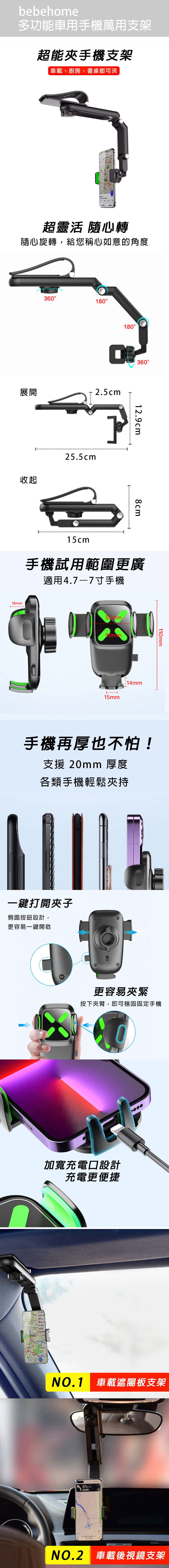 bebehome多功能車用手機萬用支架,採用優質ABS+PC材質,堅固耐用。具備一鍵開啟夾子功能,方便單手操作,輕鬆放置或取下手機。360度旋轉設計,讓您隨心調整觀看角度,無論導航或追劇都更加舒適。加寬充電口設計,充電更便捷,隨時保持手機電力。適用於4.7-7寸手機,支援20mm厚度,各類手機皆可輕鬆夾持,是您車內不可或缺的智慧裝置工具。
