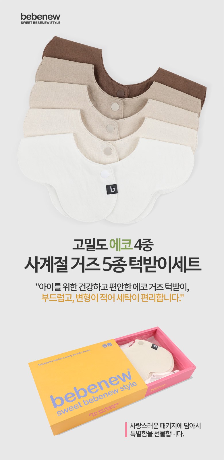 bebenew 幼兒用圍兜採用高密度環保四層紗布製成,柔軟舒適,吸水性佳,能有效防止寶寶弄髒衣物。此款圍兜經過濕式空氣蒸汽洗滌後加工,觸感更加柔軟,且不易變形,方便洗滌。暗扣設計方便穿脫,可根據寶寶頸圍調整鬆緊度。可愛的包裝設計,是送給新生兒的理想禮物。Made in Korea,品質安全有保障。