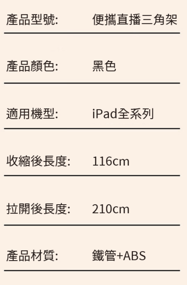 畢亞茲便攜直播三腳架是您直播、錄影的完美助手。這款黑色三腳架採用伸縮折疊設計,方便攜帶,展開後高度可達2.1米,收納後僅1.16米,輕鬆應對各種拍攝場景。通用平板夾具設計,適用於各型號iPad,讓您隨時隨地享受穩定的拍攝體驗。採用鐵管+ABS材質,堅固耐用,確保設備安全。無論是直播帶貨、線上教學還是影音創作,畢亞茲三腳架都能為您提供專業級的支撐。