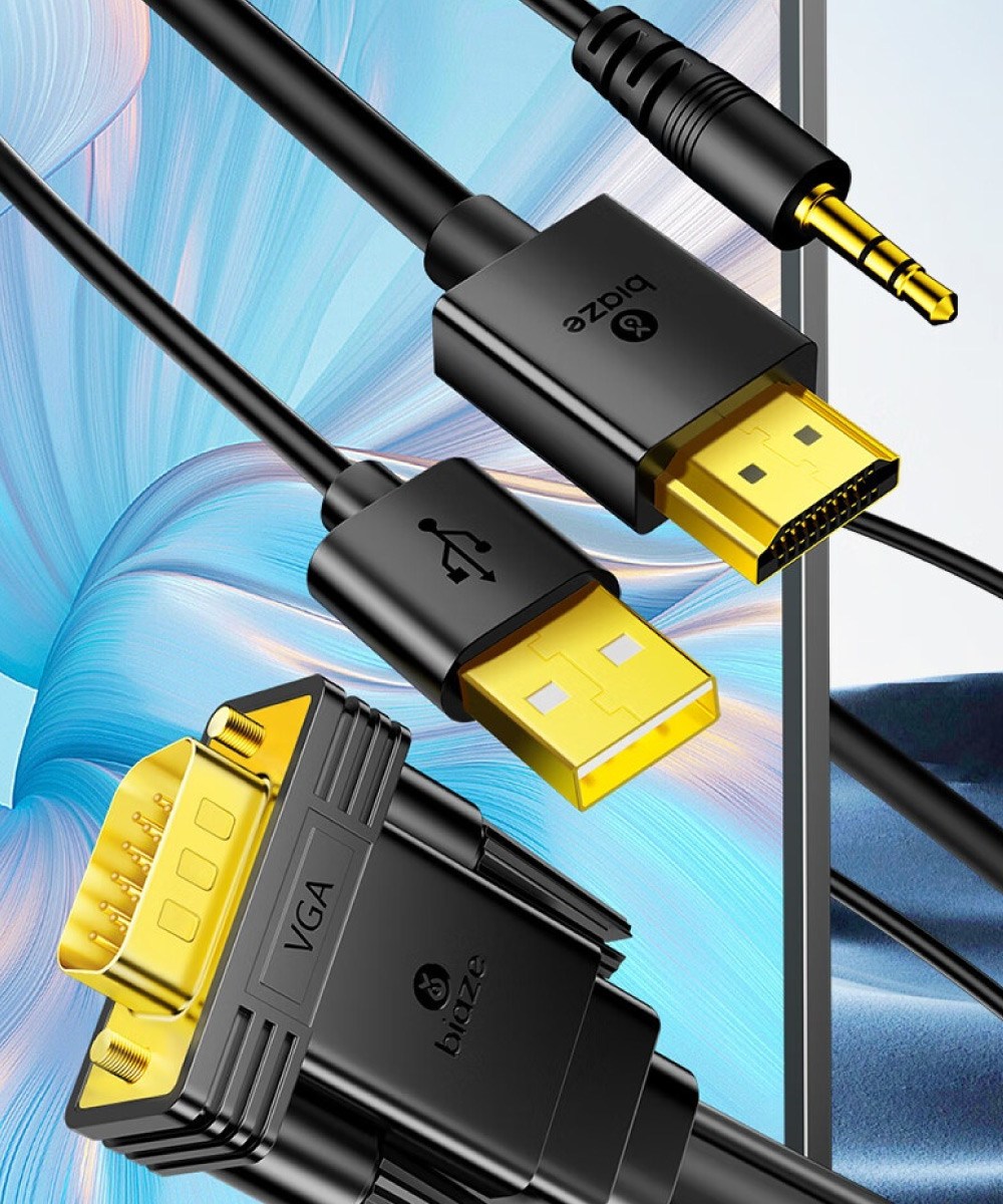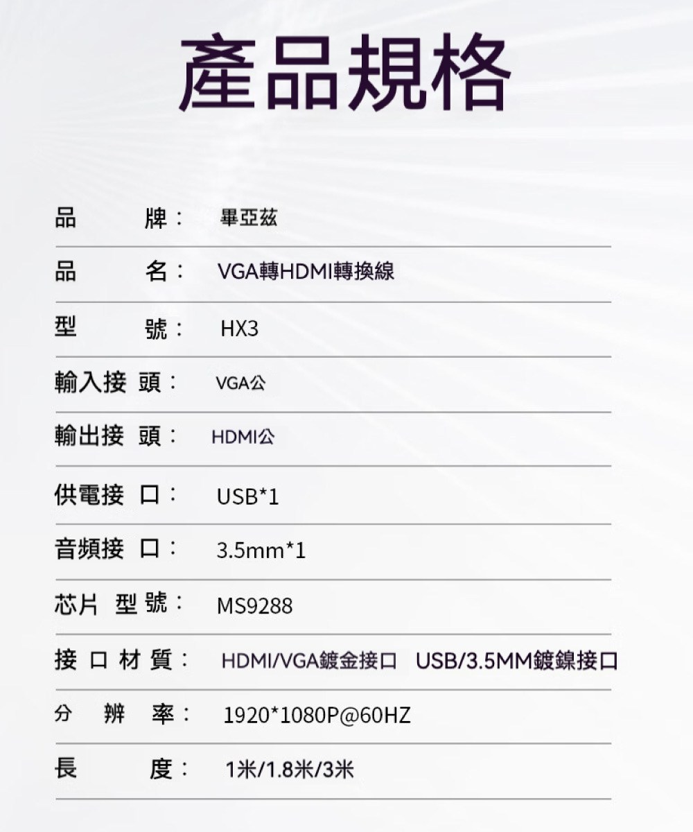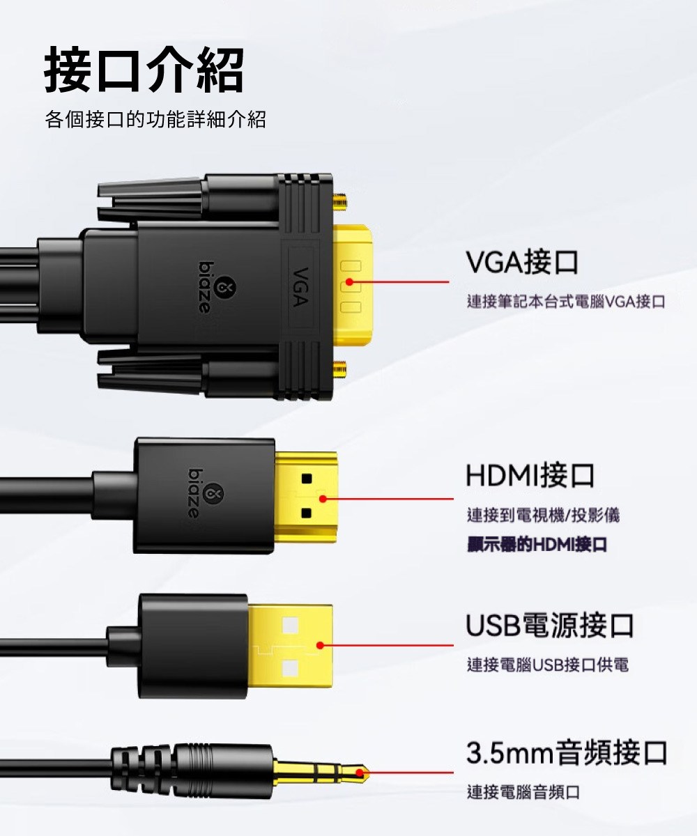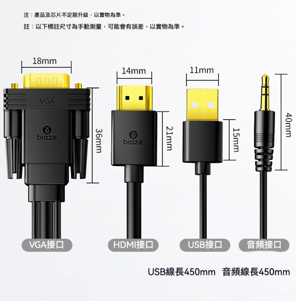 這款biaze畢亞茲VGA轉HDMI轉換器,能將電腦主機的VGA介面轉換為HDMI輸出,輕鬆連接高清顯示器,享受清晰穩定的無損畫質。支援1920*1080P@60Hz高清解析度,細節呈現不掉幀。獨立音訊+USB供電設計,讓您享受有聲世界,影音同步。廣泛相容Windows、XP、Linux、MAC OS等多種系統,無需安裝驅動,即插即用。無論是辦公還是娛樂,都能滿足您的需求。