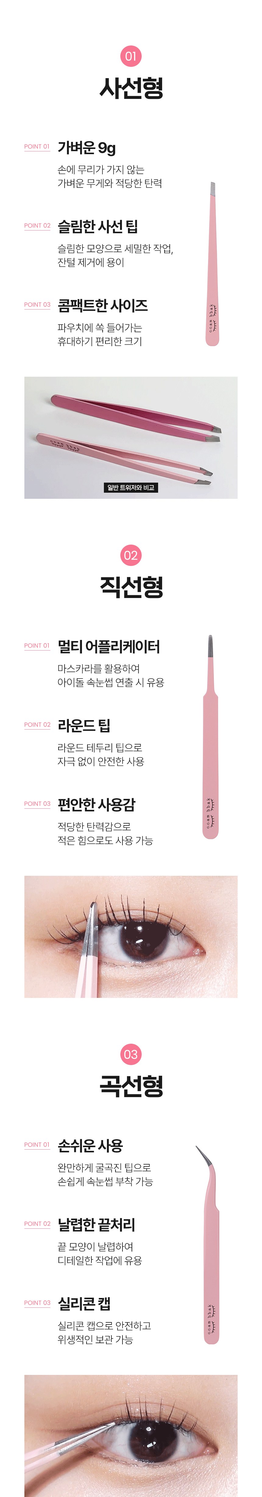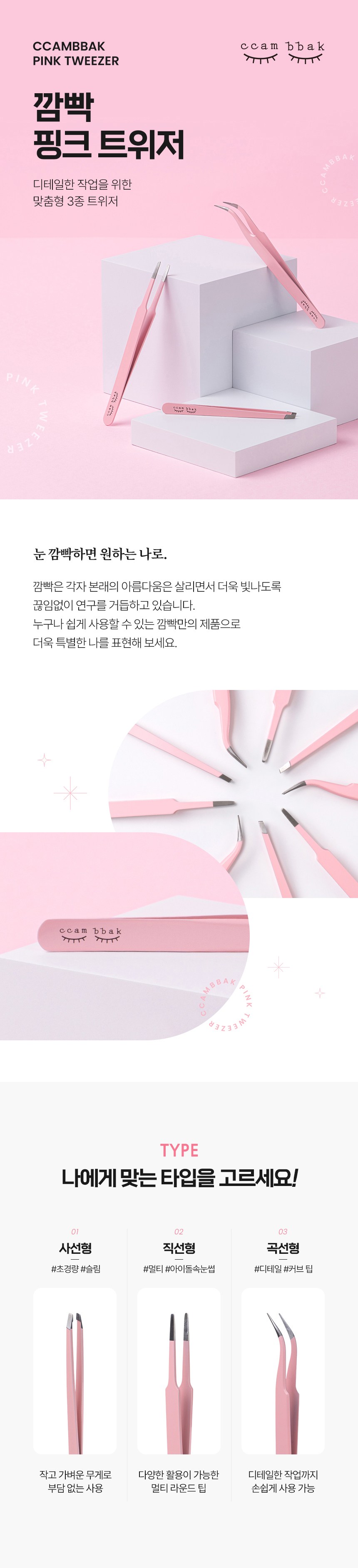 ccam bbak粉紅色鑷子,一套包含三種不同功能的鑷子,滿足您各種精細需求。斜線型鑷子尖端纖細,能輕鬆去除細小雜毛,打造完美眉型。直線型鑷子圓頭設計,可用於黏貼假睫毛,打造迷人電眼。曲線型鑷子尖端彎曲,操作更順手,讓您輕鬆完成精緻妝容。輕巧設計,方便攜帶,隨時隨地保持完美。